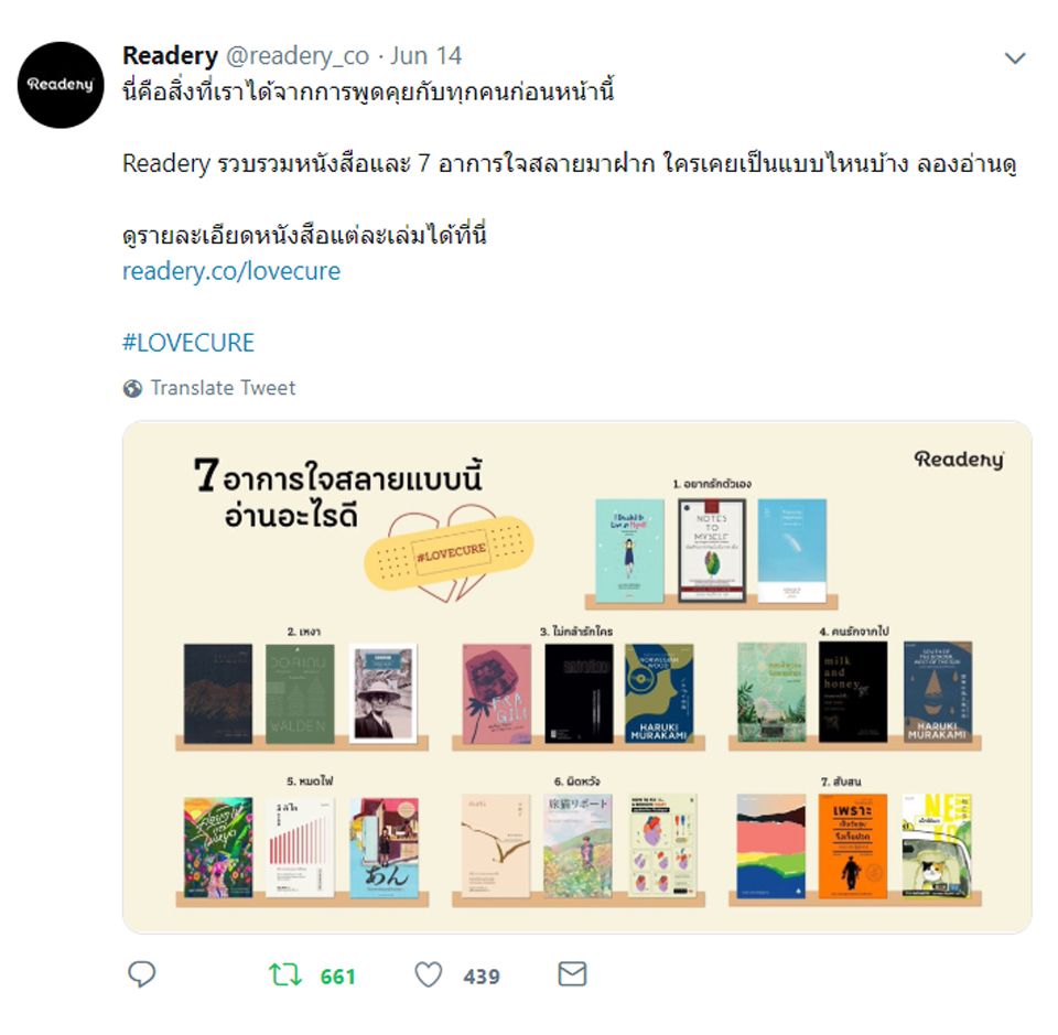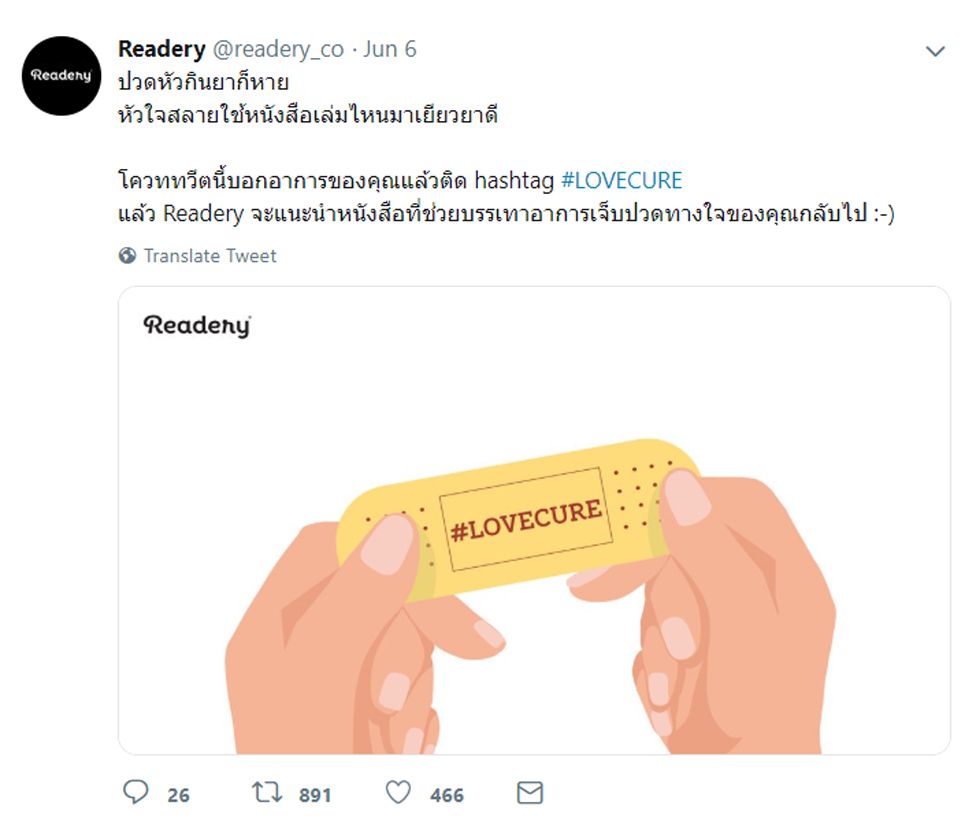 ด้วยการใช้วิธีให้คนในทวิตเตอร์บอกอาการเจ็บปวดทางใจหรืออาการใจสลายของพวกเขามา แล้วทางเราจะช่วยหาหนังสือที่ช่วยเยียวยารักษาไปให้ เพื่อเป็นการลองเชิงดูว่า คอนเซปต์ที่เราสองคนคิดไว้จะได้รับผลตอบรับเป็นไปในทางไหนบ้าง