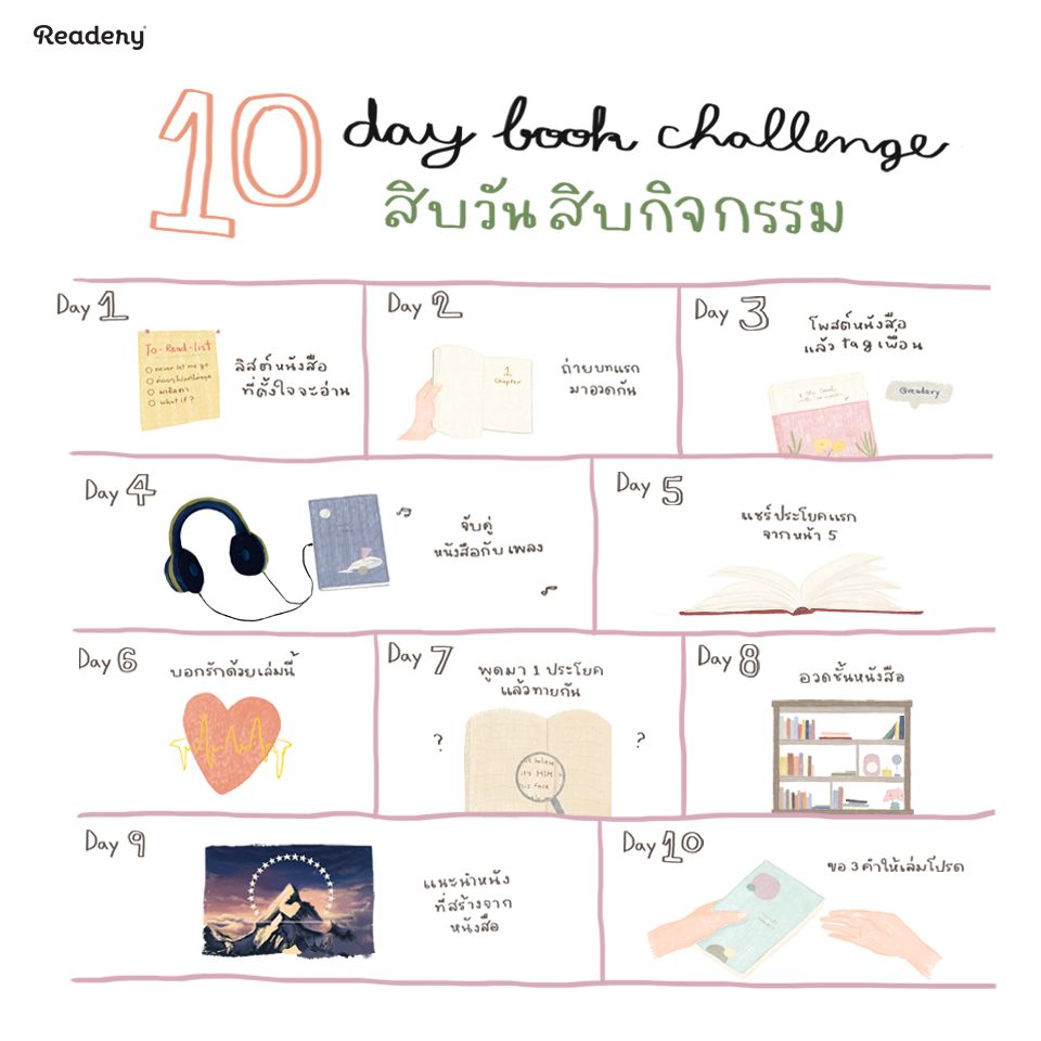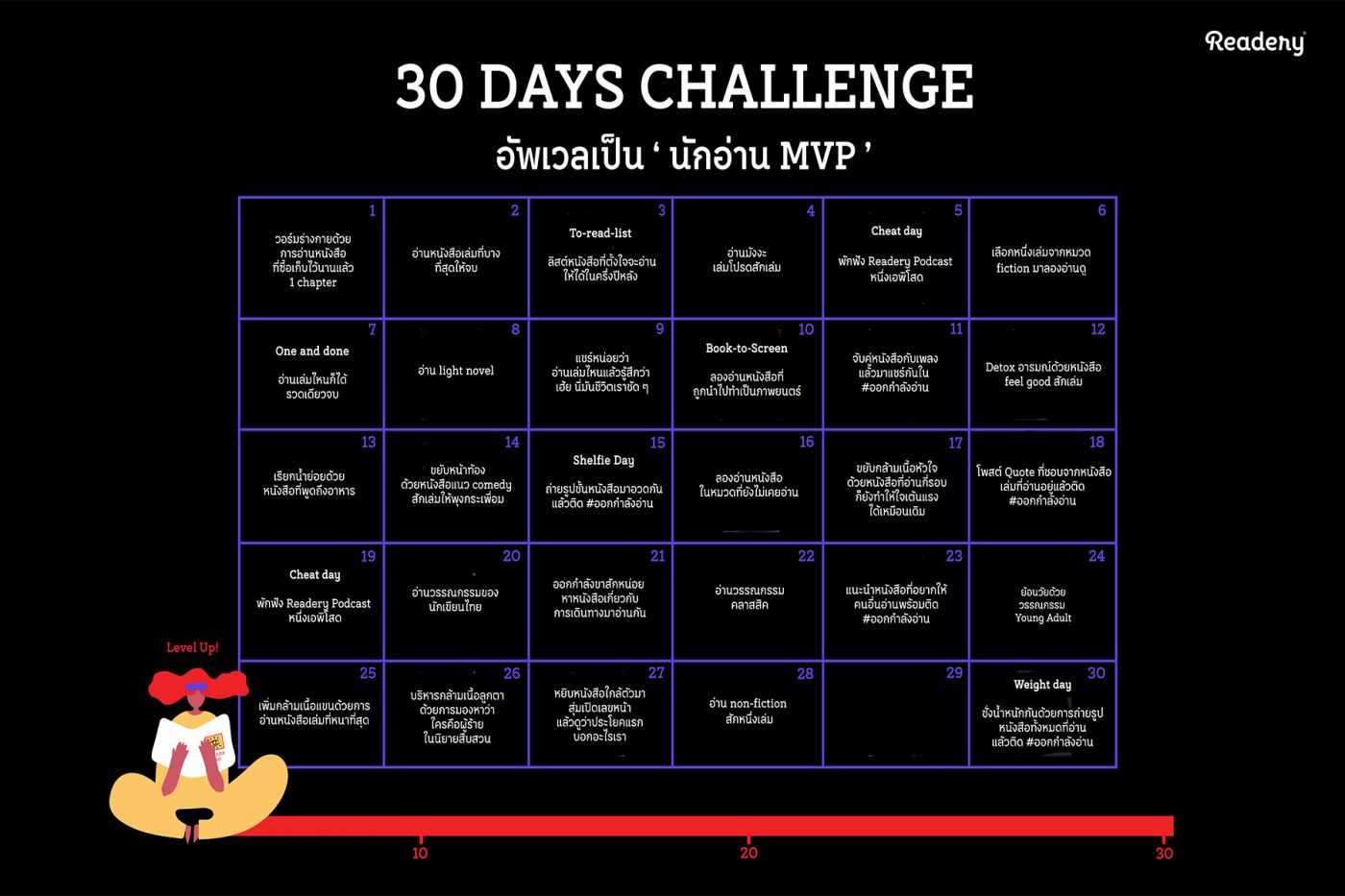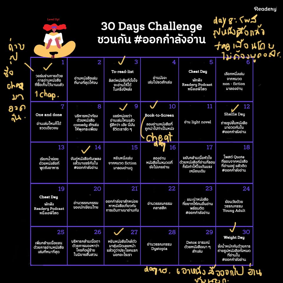 คือมีทั้งกิจกรรมวอร์มร่างกายด้วยการอ่านหนังสือที่ซื้อเก็บไว้นานแล้ว / อ่านหนังสือเล่มที่บางที่สุดให้จบเล่ม / อ่านมังงะที่ชอบ / Cheat Day พักฟัง readery podcast / เลือกหนังสือหมวด fiction มาอ่าน / บริหารกล้ามเนื้อลูกตาด้วยการมองหาว่าใครคือผู้ร้ายในนิยายสอบสวน / เพิ่มกล้ามเนื้อแขนด้วยการอ่านหนังสือเล่มที่หนาที่สุด