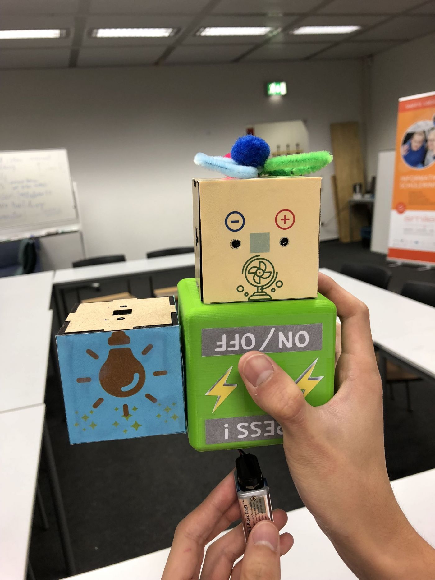 So we need to brainstorm again and redesign everything. We get that we will change the way to conductor by using small magnet and solder it. And we will redesign every block into same size also, the LED block should have some small transparent window for seeing the LED inside.