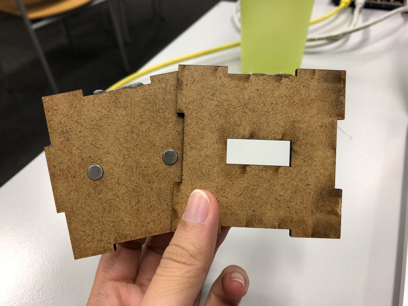 We start the work with put the magnet into hole that we prepare in our block. We need to stick the hard paper behind the hole to be like a base for magnet.