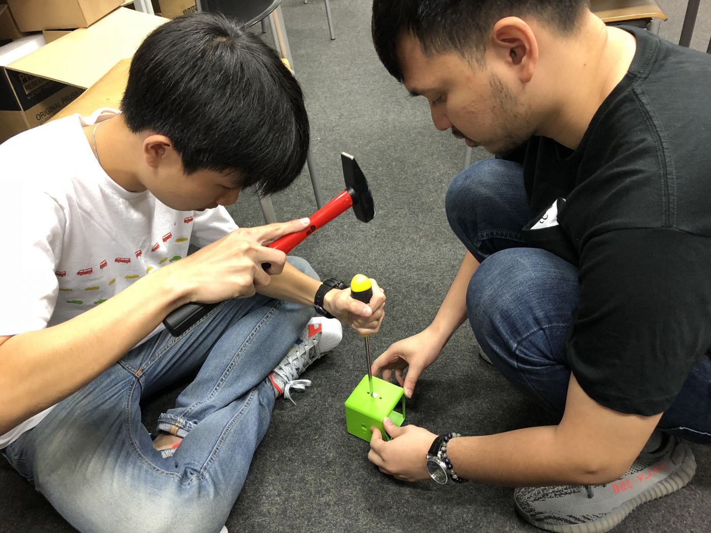 We finish the circuit in our main block and try to put the magnet in the hole. But the same as lego base, it very tight and we need to hammer it a little bit.