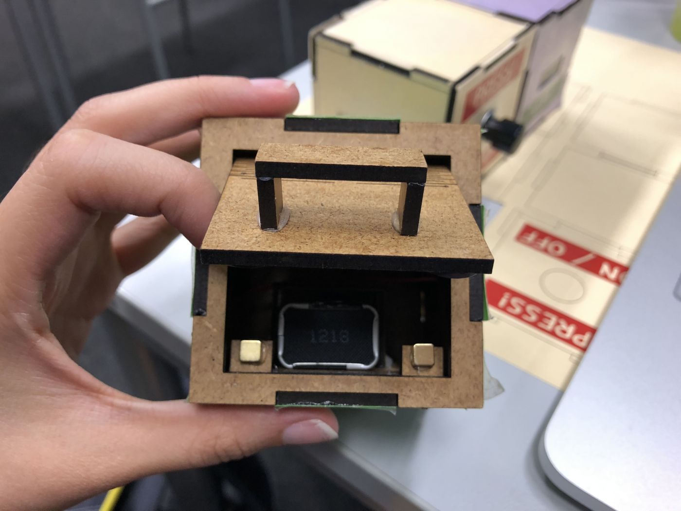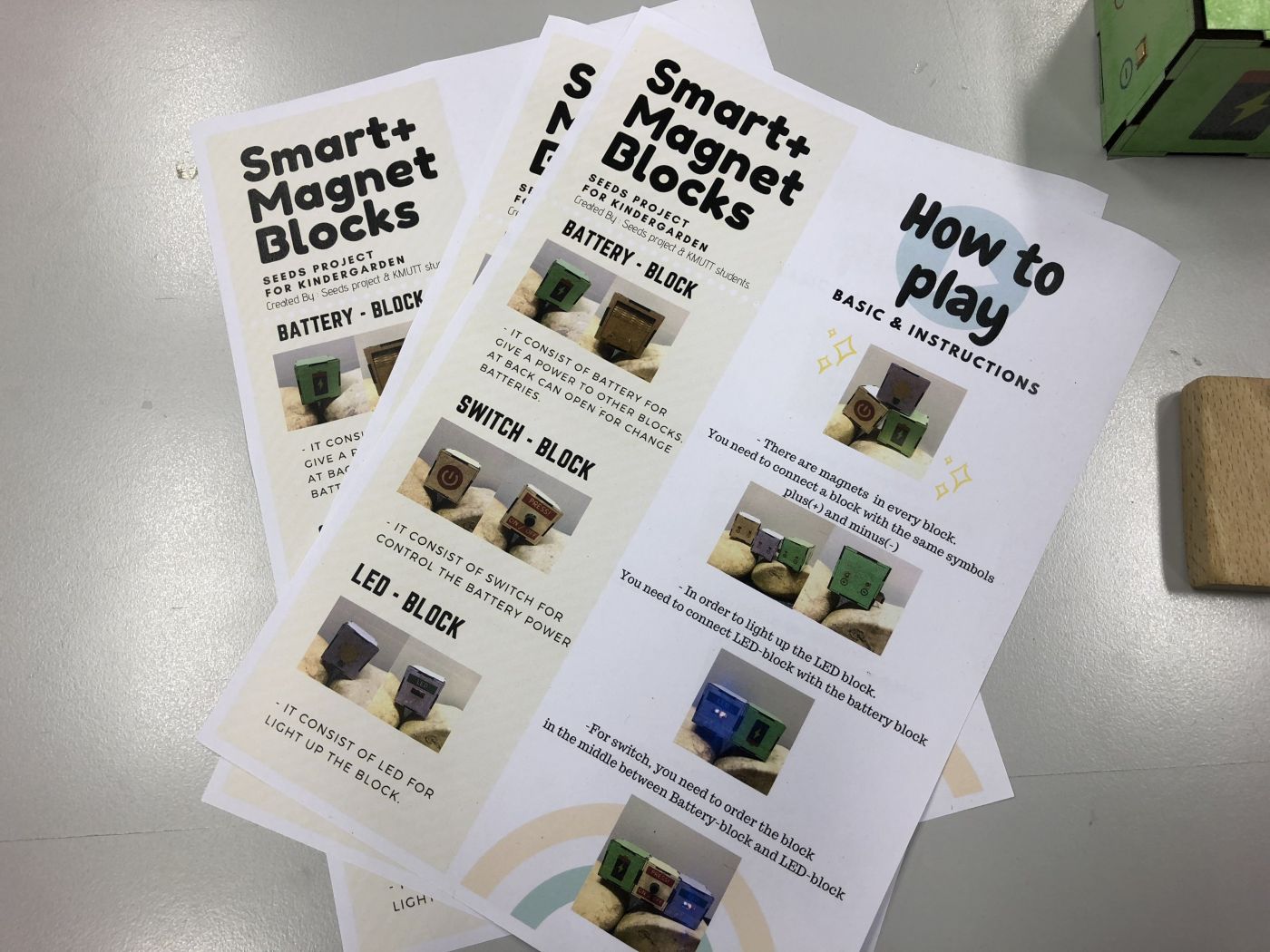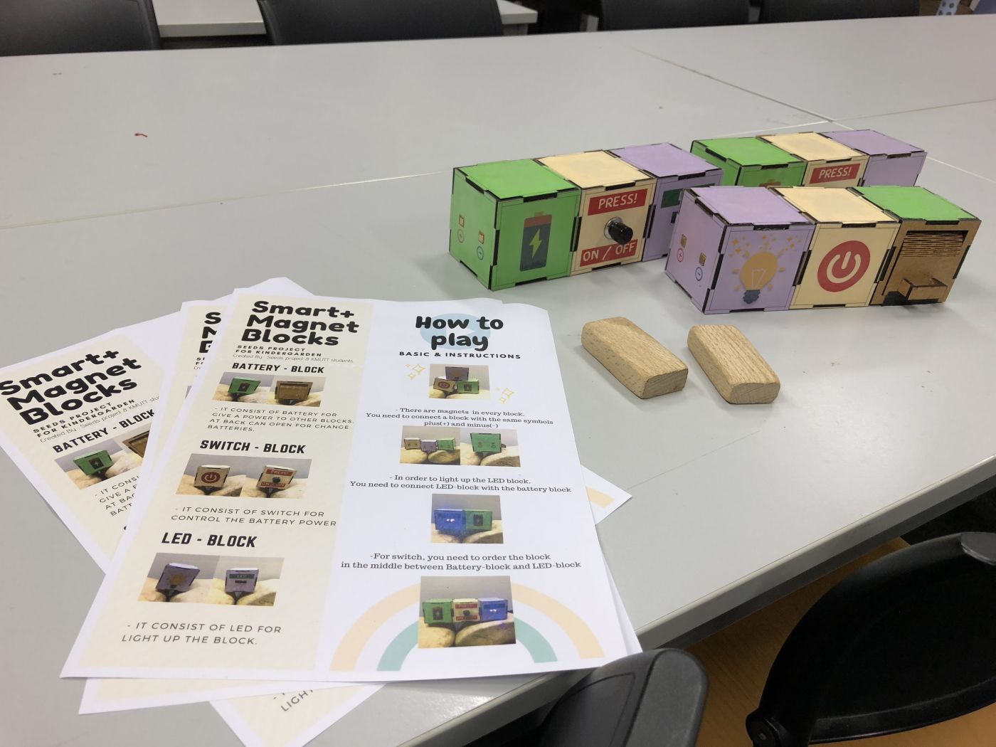 At first, the teacher let them play with their wood blocks for a while and then give our block for them. They try to connect it together with magnet first. Take not too much time finally they can connect 3 blocks in the right way that can press the switch button to turn on/off the LED.