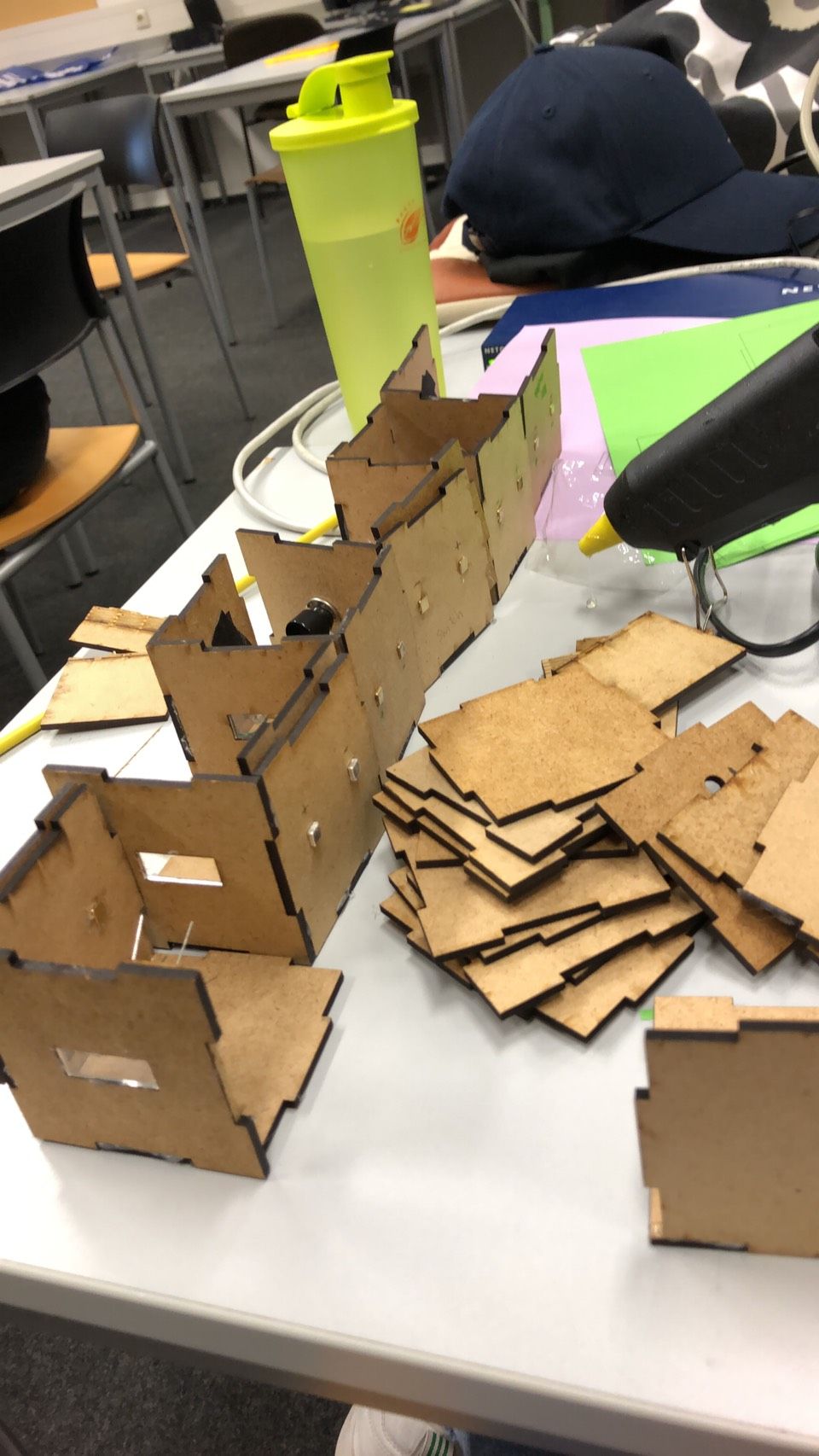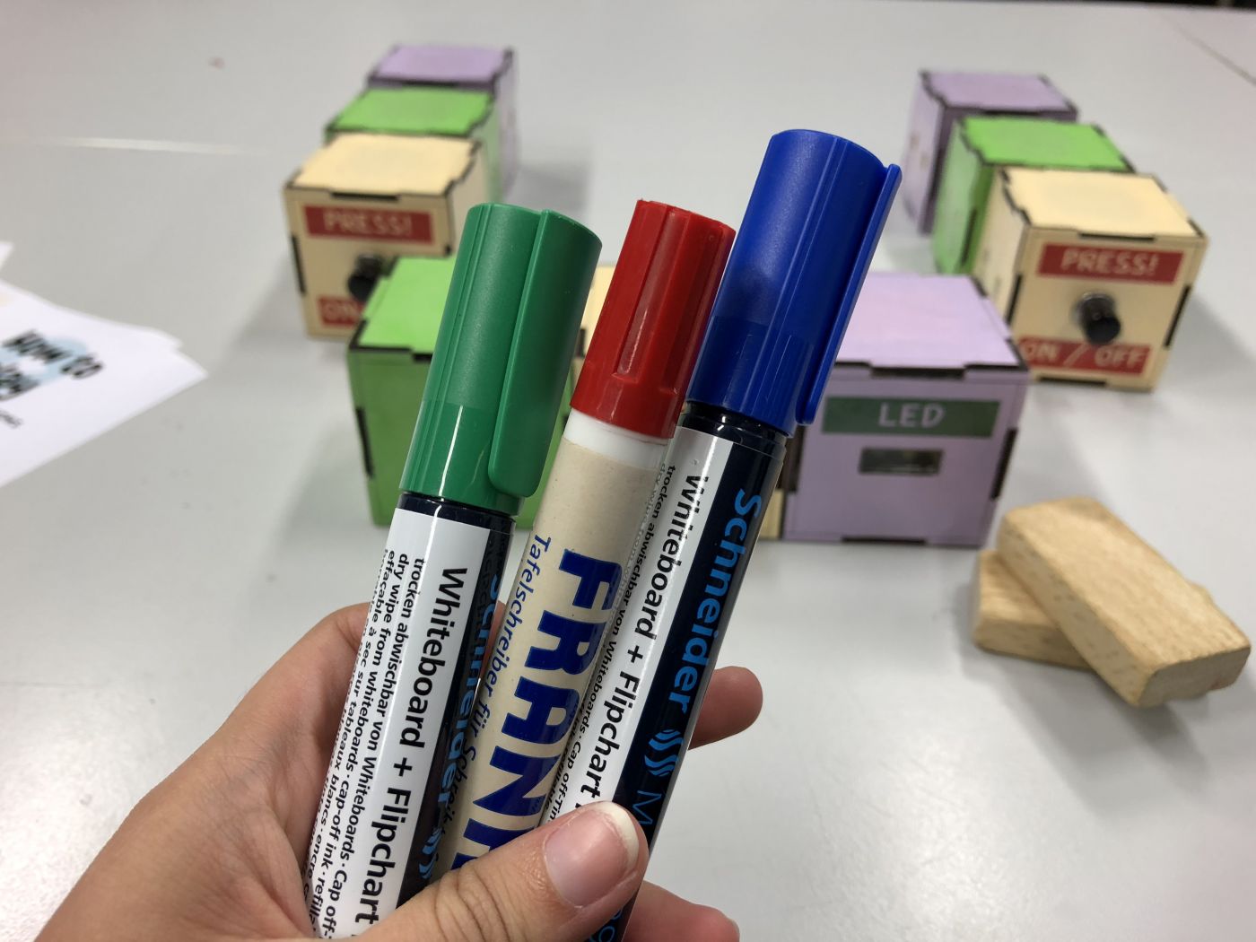 final test and fix. Before the kindergarten come. We prepare the space in the room and every equipment on the desk ; blocks, manual paper and whiteboard pen for children if they need to draw something on our blocks.