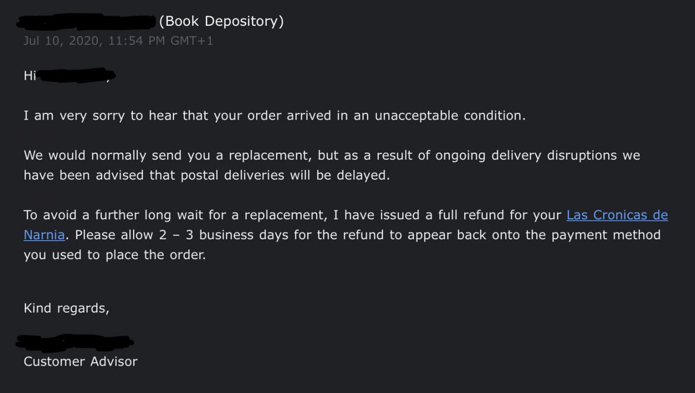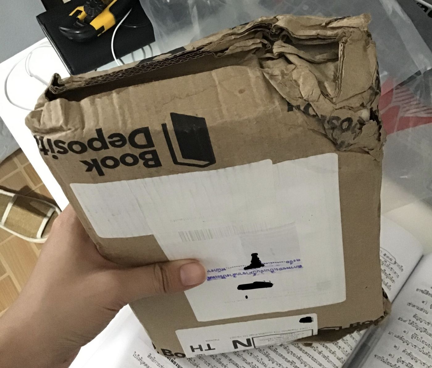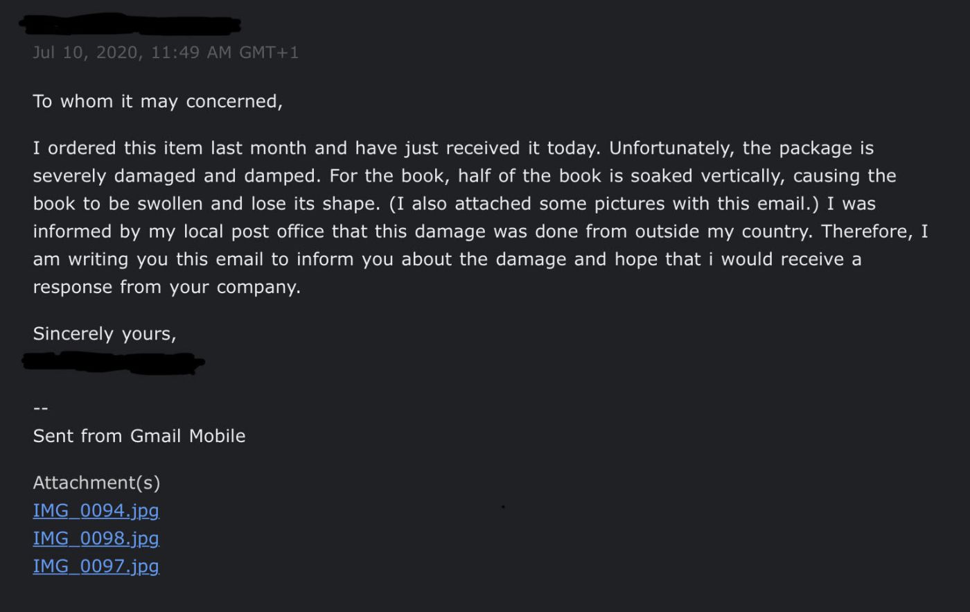 ฉันสั่งสินค้าชิ้นนี้ไปเมื่อเดือนที่แล้วและเพิ่งจะได้รับของในวันนี้ โชคไม่ดี พัสดุนั้นเสียหายอย่างรุนแรงและชื้นด้วย สำหรับหนังสือนั้น ครึ่งหนึ่งในแนวตั้งของหนังสือเปียกชุ่มทำให้หนังสือบวมและเสียรูปทรง (ฉันแนบรูปมากับอีเมลนี้ด้วย) ฉันได้รับแจ้งจากไปรษณีย์ประจำท้องที่ของฉันว่าความเสียหายนี้เกิดขึ้นจากต่างประเทศ ดังนั้นฉันจึงเขียนอีเมลฉบับนี้เพื่อแจ้งให้คุณทราบเกี่ยวกับความเสียหายและหวังว่าจะได้รับการตอบกลับจากบริษัทของคุณ