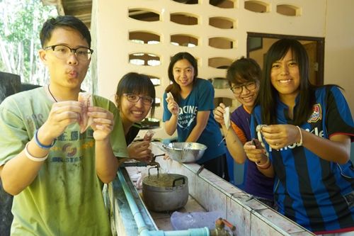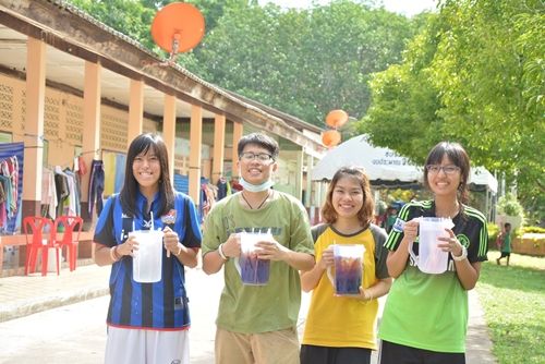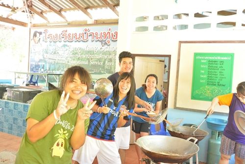 ย้อนกลับไปตอนทำอาหาร ระหว่างนั้นก็ต้องนำน้ำไปเซอวิสฝ่ายก่อสร้างรอบละชม.เหมือนเดิมเลย คราวนี้เราขออาสาออกไปเองบ้าง เพราะ สิงอยู่ในครัวตั้งแต่เช้า TAT ยังไม่ได้ออกไปพระอาทิตย์้ลย แอบคิดถึงฝ่ายก่อสร้างนิดๆ ครับ อยู่มาสองวันติด ^__ ^ ตอนเอาไปป้อนเพื่อนๆ เพื่อนถามเลยว่าวันนี้ทำปลาหมึกใช่มั้ยยย!! หมดกันครับ อุสาห์ปิดไว้ให้เซอไพรส ตอนนี้เข้าใจฝ่ายครัวขึ้นมาเลยครับ ล้างน้ำไปหลายรอบละกลิ่นยังติดมือแน่นจริงๆ 55555