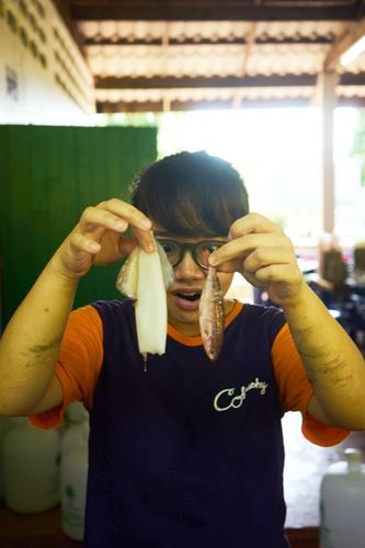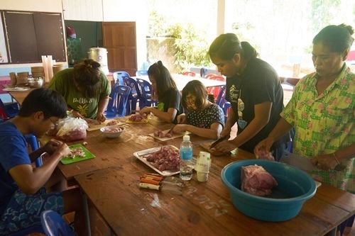 สำหรับแกงส้มหมู เรานั้นแทบไม่ได้มีส่วนร่วมในเมนูนี้เลย เพราะ เอาเวลาส่วนใหญ่ไปนั่งจัดการปลาหมึกอยู่ แต่จากการสำรวจครัวระหว่างจัดการกับน้องปลาหมึก เราก็เห็นเพื่อนๆ นั่งหั่นหมูกันอย่างเอาจริงเอาจัง หมูที่ใช้ก็เป็นเนื้อหมู ( ไม่สับ ) หั่นเป็นชิ้นๆ สวยๆ พอดีคำ XD (น่ากินชะมัด วุ้ย) ก็เห็นหลายคนช่วยกันหั่นอยู่ซักพักนึง พอเสร็จ ก็นำหมูไปทำแกงส้ม ตอนปรุงรสต่างๆ มีคุณป้าในโรงครัวมาช่วยปรุงด้วย อาหารที่ออกมาเลยอร่อยมากๆ