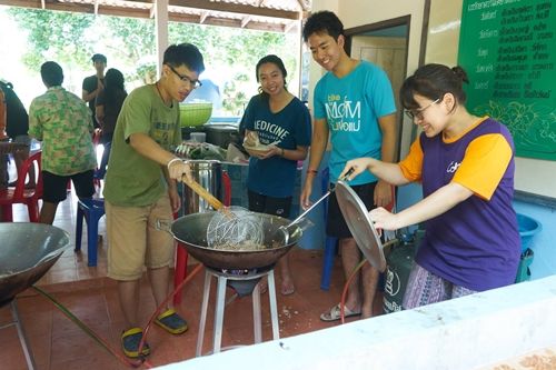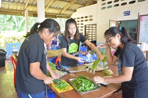 หลังจากหั่นผักไว้จนเพียงพอก็เอามาผัดครับ ตอนนี้พี่เค้าบอกว่า " น้องๆ คนไหนจะผัดบ้างเอ่ยย " ตอนแรกเหมือนจะไม่มีการตอบรับ เราเลยลองไปผัดดูดีกว่า สำหรับการผัดก็ต้องไปผัดหน้าเตา เราไม่ค่อยชอบเท่าไหร่ เพราะมันร้อนมากๆ เราก็ผัดไปเรื่อยๆ พี่เข้าก็โรยนู้นโรยนี้ ปรุงไปชิมไป พอเห็นว่ากลมกล่อมก็ตักใส่หม้อรอแบ่งเสริฟครับ