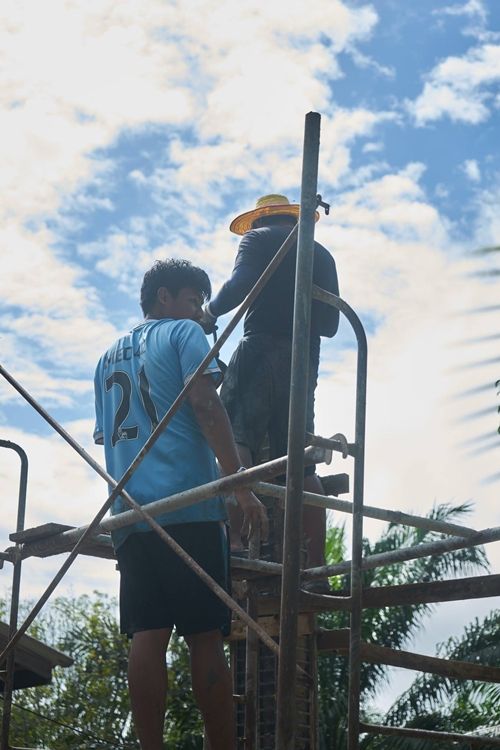 เราได้ “ก่อสร้าง” ก็จะไปตรงส่วนก่อสร้างอยู่ด้านหน้าโรงเรียนเลย(จริงมีสามทางเข้ารร. เราสรุปว่าทางนี้เป็นทางเข้าละกันนะ 55555) ตรงฝ่ายก่อสร้างจะมีสร้างฐานปูนไว้ก่อนแล้วซึ่งชาวบ้านที่นี่ระดมทุนส่วนนึงมาช่วยกันทำ แล้วก็มีดินเทพูนๆ อยู่ตรงกลางฐาน