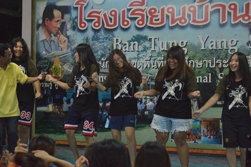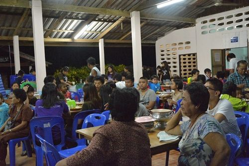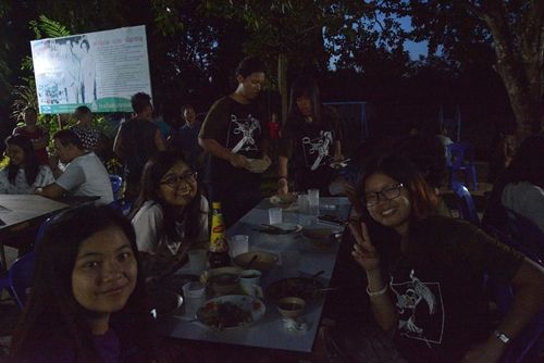 อย่างกำหนดการที่บอกไว้ พวกเราจะทานอาหารกับชาวบ้านกันที่โรงอาหารและมีการแสดงให้ดูไปพลาง หลังจากซ้อมเต้นกันพอเป็นพิธีก็ยกโขยงพากันมาจัดโต๊ะที่ครัว ครั้งนี้โต๊ะที่นั่งทานอาหารจะล้นออกมาข้างนอกด้วย เพราะแบ่งไปให้ชาวบ้านนั่งข้างในแล้วพวกเรานั่งข้างนอก หลังจากรอชาวบ้านอยู่พักหนึ่งทุกคนก็เริ่มทยอยกันมา ทว่าทุกคนทายอาหารมาจากบ้านกันหมดแล้วอาหารที่เตรียมมาจึงเป็นอาหารสำหรับพวกเราทั้งหมด ต้องขอบคุณทุกคนมากเลยล่ะครับอาหารมื้อนั้นอร่อยจริงๆ