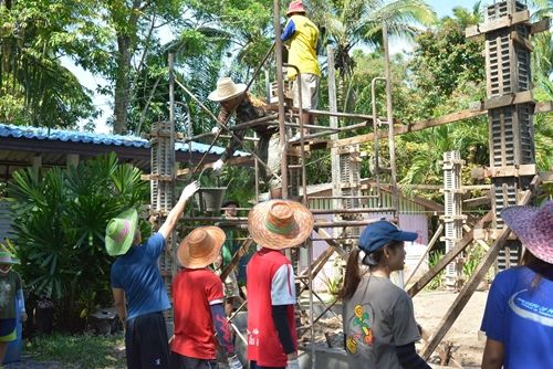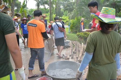 ช่วงเช้าพวกเราทำไปได้ 5 เสาจากทั้งหมด 8เสา เลยต้องมาลุยต่ออีกทีช่วงบ่าย แต่ละเสาจะใช้ปูนปริมาณ อ่างครึ่ง ดังนั้น พอเอาไปเทจนหมดอ่างก็ต้องรีบกวนปูนต่อเลย มีสองอ่างสลับกัน อ่างนึงเอาไป อีกเทอ่างนึงกวนปูน ตอนทำงานไป เพื่อนๆ ก็มีเรื่องคุยไปด้วย ปากก็ขยับ มือก็กวนกันไป 55555