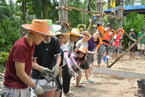 หลังจากทานอาหารกันอิ่มน้ำสำราญ เราก็ไปงานก่อสร้างตามที่แบ่งไว้เมื่อวานทันที พวกเราก็มาหยิบอุปกรณ์กัน อุปกรณ์ที่มีให้ก็คือ หมวกฟางง XD (ใส่แล้ว มังกี้ D ลูฟี่มาก 5555555 ) ถุงมือยาง ใส่ไว้ข้างในแล้วทับด้วยถุงมือผ้าที่ช่วยลดแรงกด เวลายกของจะได้ไม่เจ็บมือ พี่เค้าบอกว่าให้ใส่ถุงมือยางด้วยเพราะกันปูนโดนมือตรงๆ แต่มีเพื่อนเราคนนึงบอกว่าใส่ถุงมือยางแล้วจั๊กจี้มือด้วย 5555