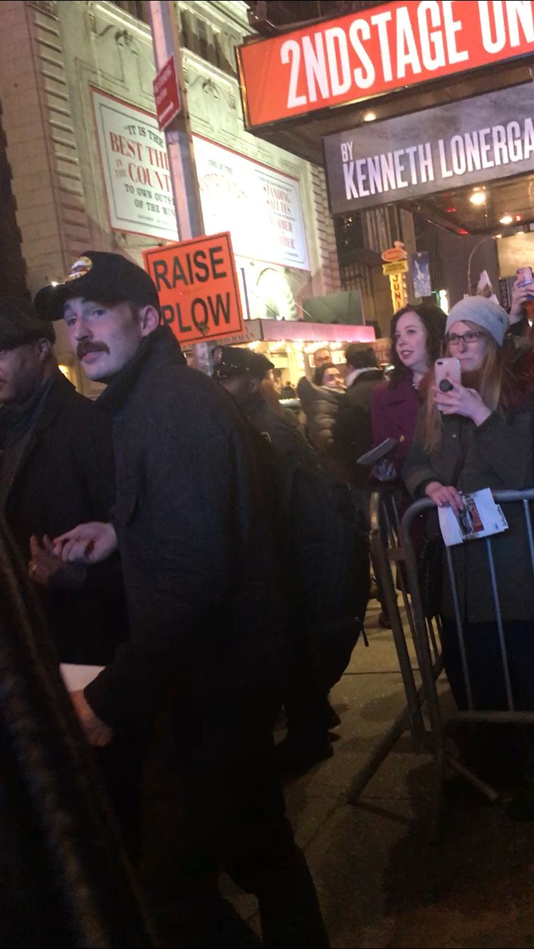 ละครที่พี่คริสเล่นเป็นละครพูดชื่อ Lobby Hero เขียนบทโดย Kenneth Lonergan พี่คริสแสดงสดทุกคืน แสดงวันแรก วันที่ 1 มีนาคมค่ะแต่เปิดการแสดงจริง ๆ วันที่ 26 มีนาคม ช่วงแรก ๆ ก่อน Opening night เรียกว่าช่วง Preview ค่ะเหมือนรอบลองไฟ คือแสดงเพื่อดูปฏิกิริยาของผู้ชม การแสดงอาจมีการเปลี่ยนแปลงบ้างเพื่อตอบรับกับกระแสผู้ชม โชคดีที่มหาวิทยาลัยปิดช่วงนี้พอดี เราเลยรีบซื้อตั๋วมาดูค่ะ อยากเจอพี่คริสตัวเป็น ๆ อีกอย่างบรอดเวย์มีธรรมเนียมการทำ Stage door ค่ะ คือนักแสดงส่วนมากจะออกมาพบปะแฟน ๆ แจกลายเซ็นที่ประตูด้านนอกหลังการแสดงจบ (แต่ต้องบอกว่าอย่าคาดหวังมากเพราะนักแสดงบางคนก็ไม่สะดวกออกมาทำ stage door อย่างพี่คริสสัปดาห์แรกๆก็ไม่ออกมาค่ะ อยากเจอต้องใช้แต้มบุญระดับหนึ่ง) แต่ที่จริงเราก็ไม่หวังมากนะว่าจะได้เจอ แค่ได้ไปสนับสนุนพี่ ดูพี่แสดงสดก็ดีแล้วอะ นอกนั้นต้องพึ่งแต้มบุญและการบนบานกับเจ้าแม่ทวิตเตอร์555 เราซื้อตั๋วถูกสุดรวมภาษีและค่า service charge ก็ราวๆ 130 ดอลล่าห์ค่ะ ได้นั่งชั้นลอย สามแถวสุดท้าย (ไกลเว่อร์ แต่งบมีน้อยใช้สอยประหยัดค่ะ) โชคดีที่โรงละครค่อนข้างเล็ก เลยดูเหมือนไม่ไกลเวทีเท่าไร แต่ก็ไม่เห็นชัดเห็นพี่คริสเป็นตัว ๆ เห็นหนวด แต่ไม่ค่อยเห็นหน้าค่ะ 555