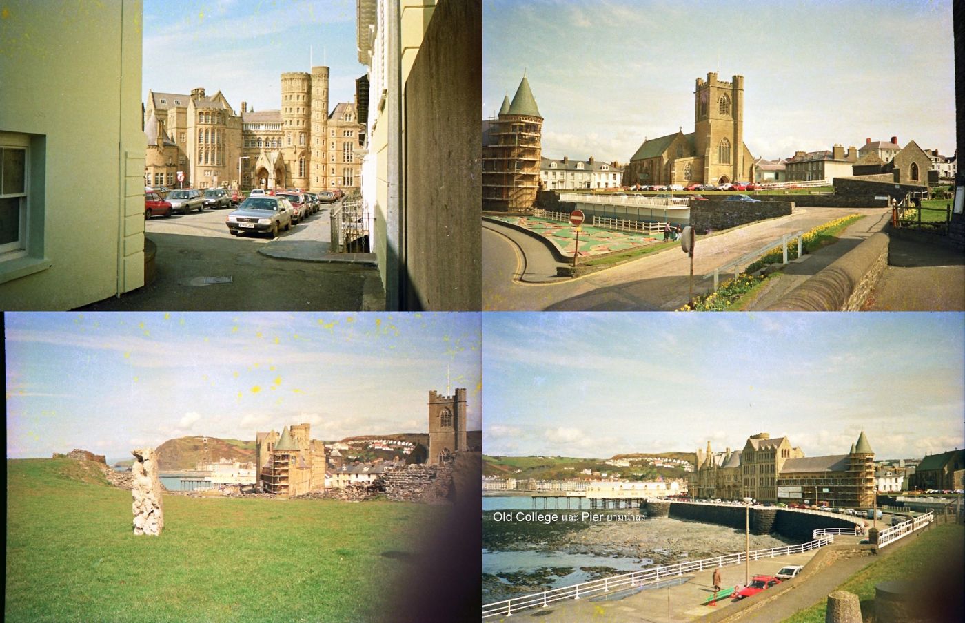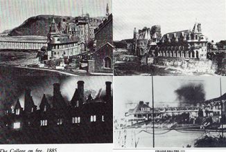 ภาพจากหนังสือ “Born on a Perilous Rock” byW.J.Lewis และ “Aberystwyth and District and the Vale ofRheidol Railway” by William Troughton ตึก Old College เมื่อแรกตั้งและเหตุไฟไหม้ในปี 1885 และ 1933