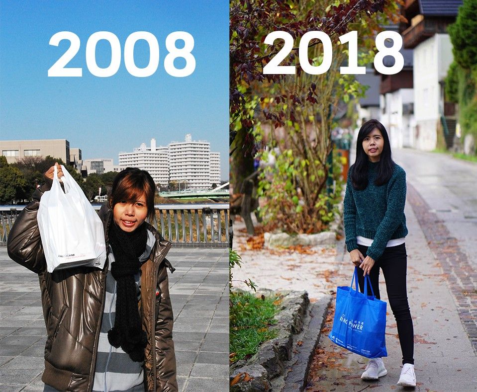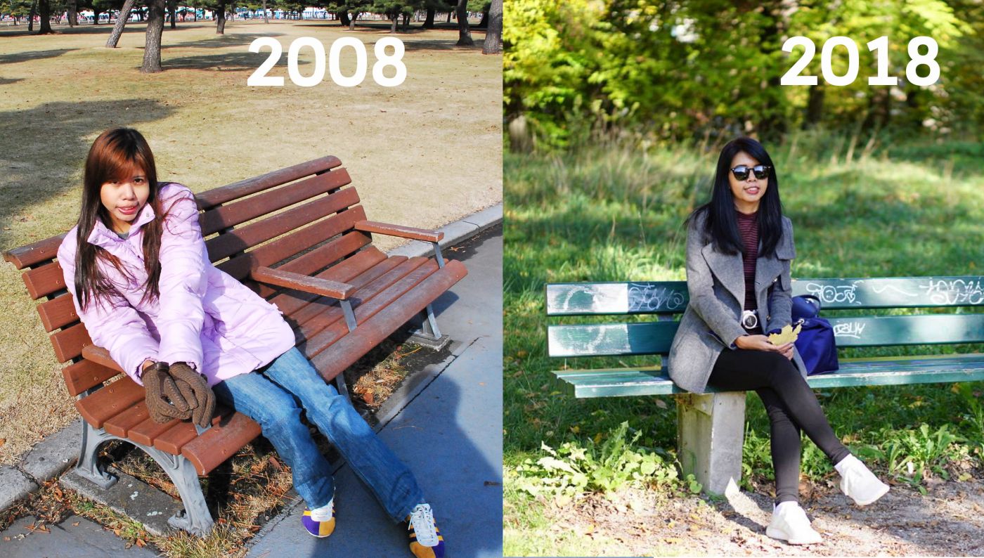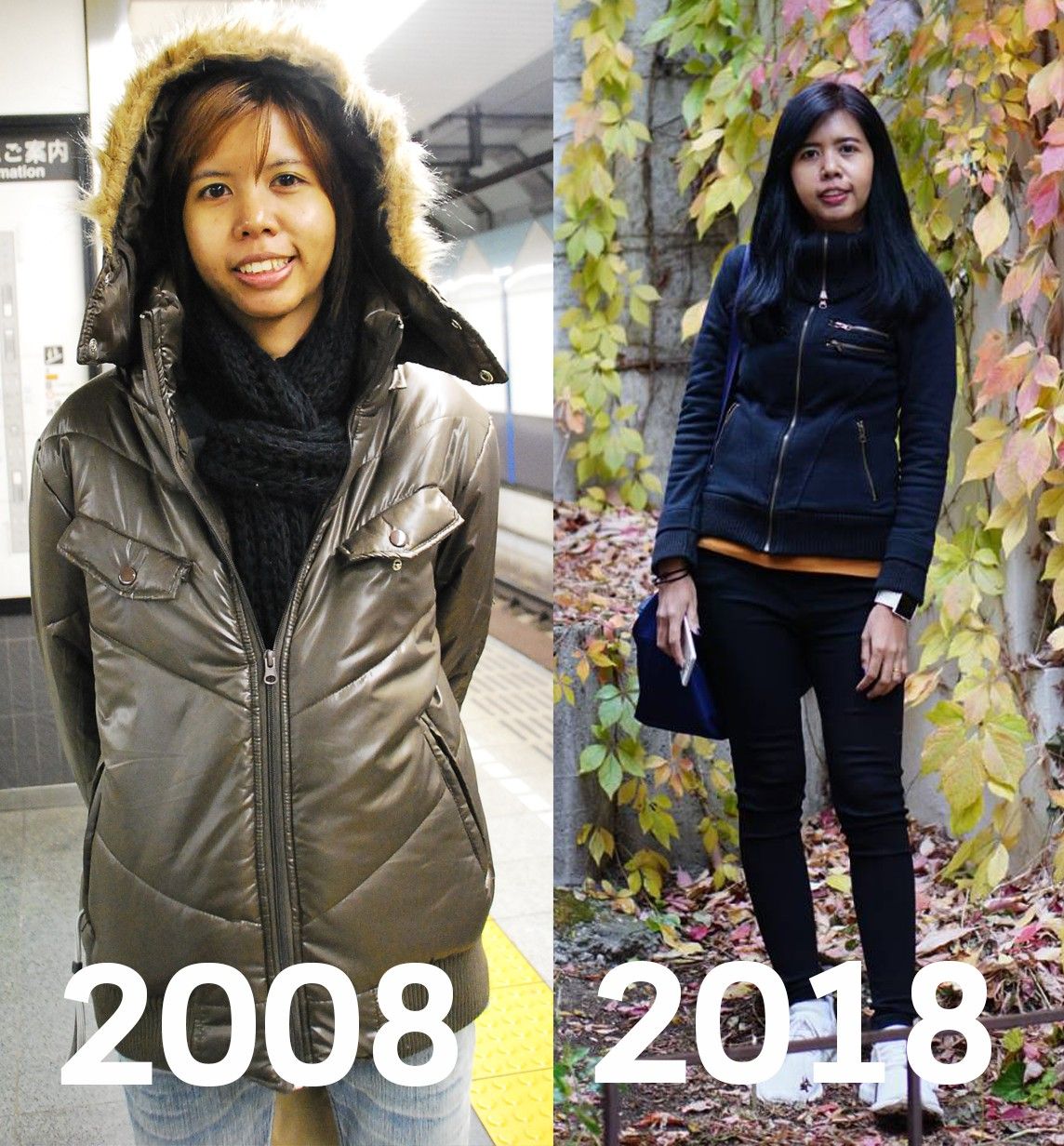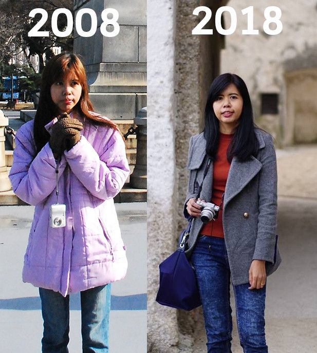 เลยย้อนไปหารูปเก่า ๆ มาดู นอกจากหน้าตาที่สก๊อยยยมากแล้ว เสื้อผ้าก็ดูเชยมาก จำได้ว่ายืมเสื้อกันหนาวของแม่สามีไป สีชมพูสดใส ไม่ได้เข้ากับตัวดำ ๆ ของเราเลย แถม oversize ไปมาก