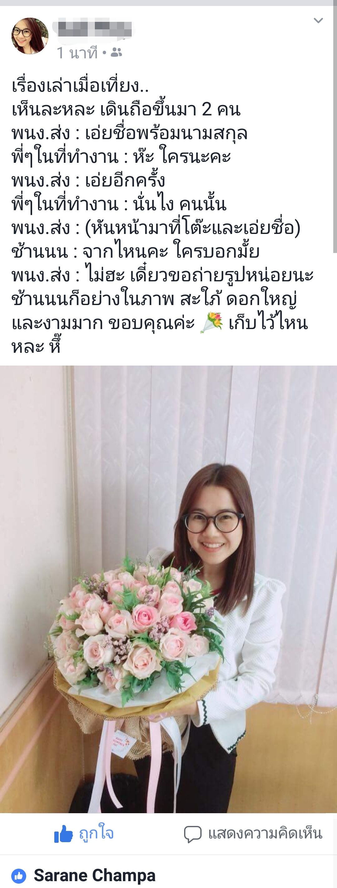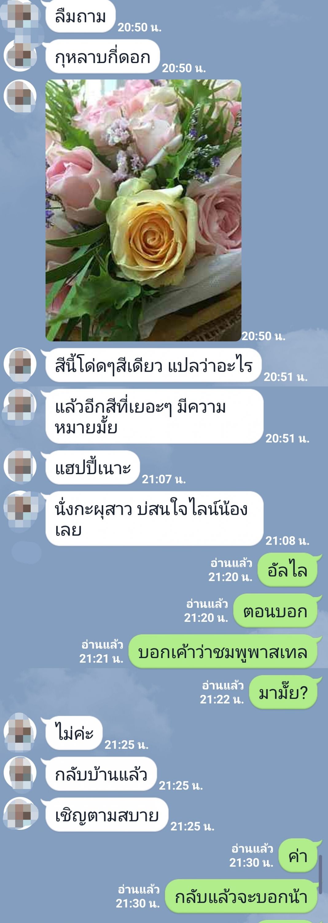นางมาบอกที่หลังว่า เดาได้ตั้งแต่ถามว่าร้านไหน? คือกุก็ใช้บริการแต่ร้านนี้ส่งดอกไม้นางไงตั้งกะจีบกันแรกๆ กุก็ลืมไปว่าถ้าถาม นางก็จำได้ว่าร้านนี้เป็นประจำกุไง แต่ผลตอบรับดีจ้า นางก็หน้าบานตามประสาคนได้อวดดอกไม้น่ะแหละ