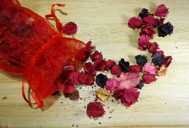 ที่ทำจากดอกไม้แห้ง ถุงบุหงาจะเป็นผ้าโปร่งเย็บประกบกับผ้าสำลีทรงหัวใจสีแดงแจ๊ด อัดแน่นไปด้วย ดอกไม้แห้งอาทิเช่น