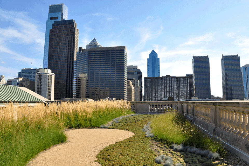 การเพิ่มหลังคาเขียว (Green Roof) ให้สิ่งก่อสร้างในพื้นที่เมืองก็สามารถช่วยบรรเทาปัญหาการเปลี่ยนแปลงของสภาพภูมิิอากาศหรือ climate change ได้เป็นอย่างดี ที่เมืองฟิลาเดลเฟียที่ประสบปัญหาน้ำท่วมฉับพลันบ่อยครั้งคล้ายคลึงกับกรุงเทพมหานครได้ใช้วิธีการเพิ่มหลังคาสีเขียวให้กับอาคารและตึกรามบ้านช่องเพื่อช่วยเพิ่มพื้นที่ดูดซับน้ำฝนแทนที่จะปล่อยลงท่อระบายน้ำอย่างเดียว มีิงานวิจัยยืนยันว่า Green Roof สามารถช่วยดูดซับน้ำฝนได้มากถึง 50-90% ช่วยลดมลพิษในอากาศ มีส่วนช่วยควบคุมอุณหภูมิในเมืองไม่ให้ร้อนจนเกินไป และยังช่วยคืนระบบนิเวศในกับสังคมเมืองที่แทบจะไม่หลงเหลือที่อยู่อาศัยให้กับพืชและสัตว์นานาพันธุ์อีกต่อไป สังคมเมืองที่มีพื้นที่ใช้สอยอย่างจำกัดและคับแคบ การใช้พื้นที่ทุกตารางนิ้วให้มีค่าจึงเป็นสิ่งจำเป็น ฉะนั้นการเพิ่ม Green Roof จะช่วยให้เราสามารถใช้พื้นที่โล่งกว้างบนชั้นสูงสุดของตึกอย่างมีประโยชน์ ทั้งยังช่วยเพิ่มพื้นที่พักผ่อนหย่อนใจให้กับผู้คนที่อาศัยอยู่ในอาคารได้อีกด้วย