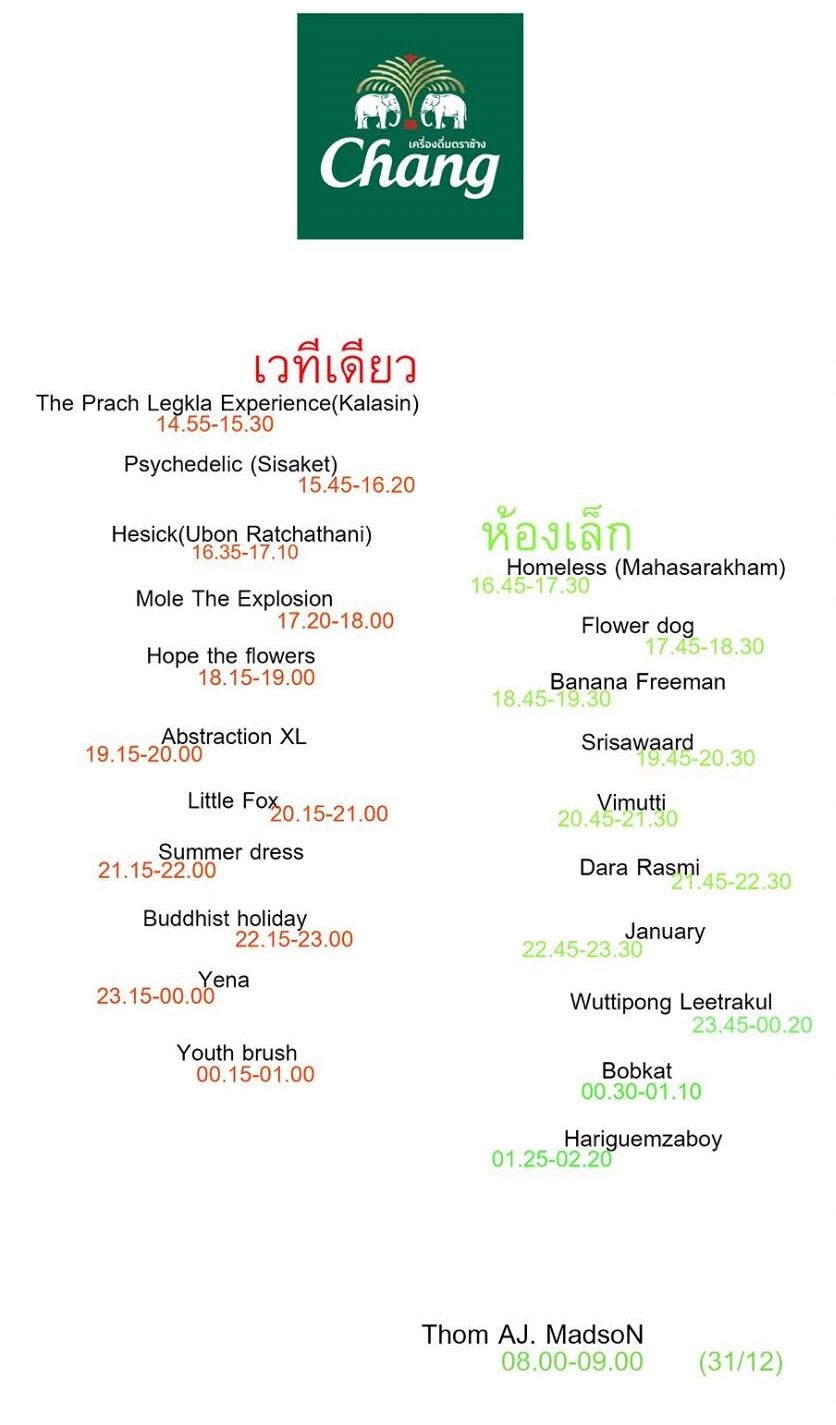 มาต่อกันที่ Line Up ศิลปินที่จะมาเล่นกันที่งานนี้กันค่ะ ตามโปสเตอร์ด้านล่างนี้ค่ะส่วนตัวคือหลายวงจะได้ดูเป็นครั้งแรก และอยากดูมาตลอด แต่ยังหาสถานที่หรืองานที่เหมาะสมที่วงไปเล่นไม่ได้ พอเจอไลน์อัพในงานนี้ จบเลยค่ะ โดนดักทาง ล็อควันไว้อย่างแน่น ไม่พลาดค่ะเหตุที่ไม่พลาดคือ เป็นคนบ้านเดียวกัน แต่อยู่ต่างอำเภอค่ะ ห่างจากสถานที่จัดงานประมาณ 30 โล ขับรถไปกลับได้สะดวกสบายดีค่ะ และอีกอย่างคือดูปีนี้เป็นครั้งที่ 3 แล้ว แต่ไม่ได้ดูครั้งแรกค่ะ