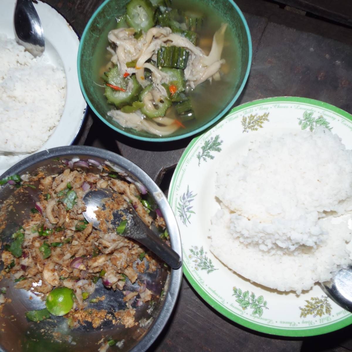 อาหารเย็นวันนี้เป็นแกงเห็ดใส่บวบและ ลาบเห็ดเพราะมีผักชีใบเลื่อยอยู่ข้างบ้านของเรา และคุณแม่ก็เก็บมา เราจึงแอบเอามาใช้ แบบนั้นเลย