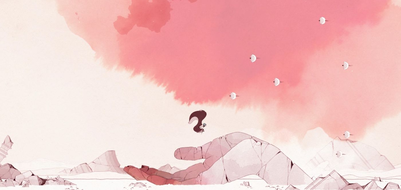 In the beginning of the game, Gris is singing on the palm of a gigantic female statue before she abruptly loses her voice and falls a long way down into the middle of nowhere. There, Gris slowly stands and finds out that she is surrounded by a vast desert filled with collapsed buildings and mysterious creatures. Everything seems to be lifeless and bereft of color.