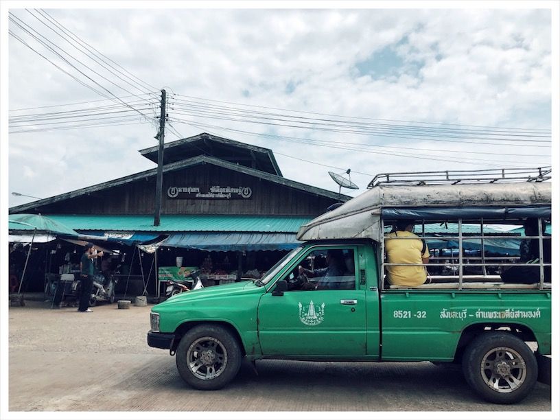 คุณป้าเดินมาตาม เราเดินไปขึ้นรถสองแถวคันสีเหลือง