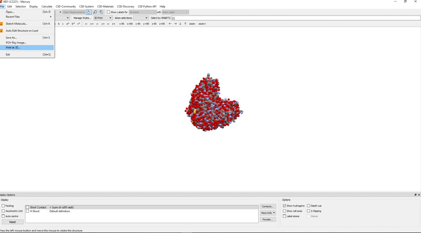 เมื่อบันทึกแล้วนำโครงสร้างนั้นไปเปิดในโปรแกรม Mercury ทำให้สามารถปรับแต่งลักษณะของโครงสร้างเคมีได้ตามต้องการและสั่งพิมพ์ด้วย print 3D ได้
