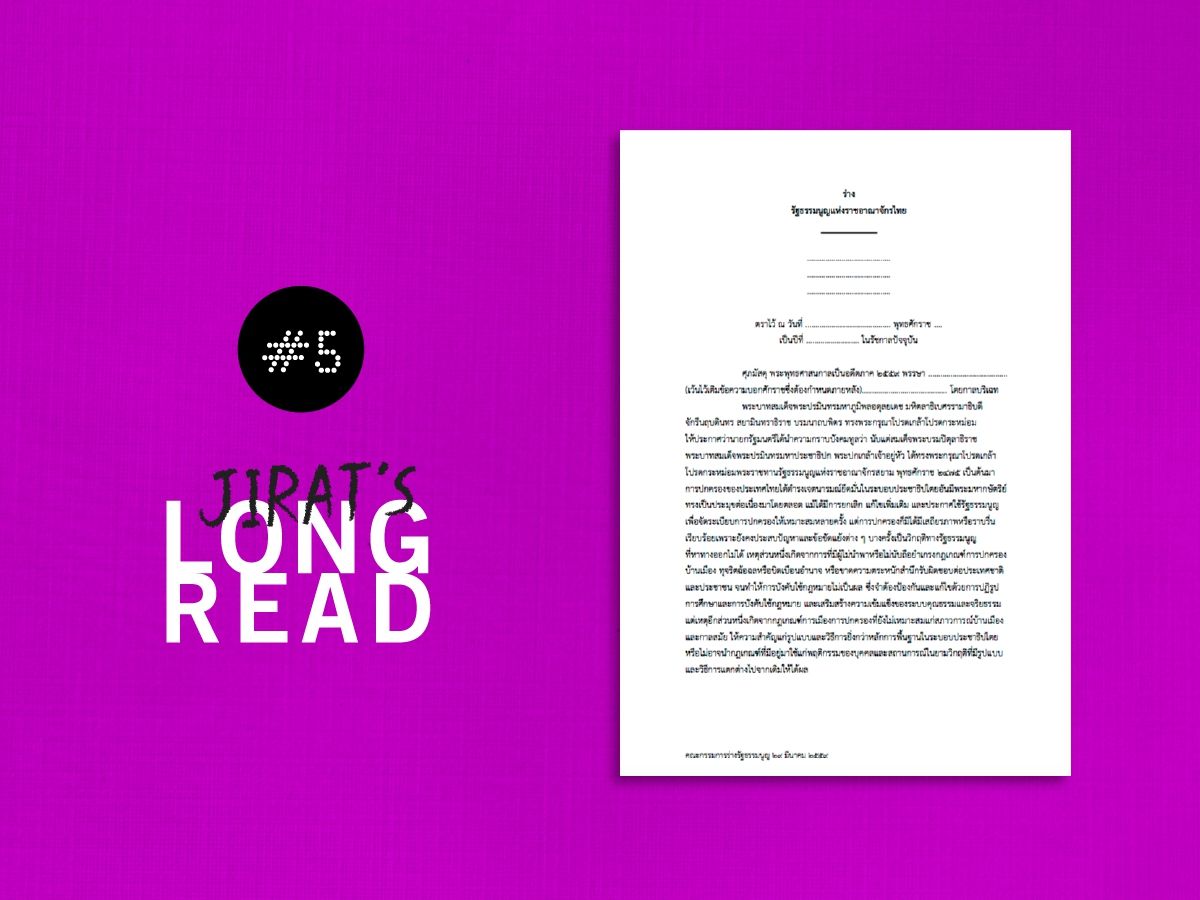 "ล่าสุดรัฐบาลพยายามผลักดัน พรบ.การออกเสียงร่างประชามติร่างรัฐธรรมนูญ ซึ่งเป็นพรบ.ที่เอาผิดถึงขั้นเข้าคุกเข้าตารางกับใครก็ตามที่ออกมารณรงค์หรืออภิปรายให้รับหรือไม่รับร่างรัฐธรรมนูญ และล่าสุดไปกว่านั้น (เมื่อวันที่ 27 เม.ย.นี้เอง) ก็มีประชาชนแปดคนถูกทหารอุ้มไปอย่างหน้าด้านๆ เพียงเพราะเขาแสดงความคิดเห็นต่อร่างรัฐธรรมนูญฉบับนี้ ตลกดีเหมือนกัน เพื่อการได้มาซึ่งประชาธิปไตย แต่คนไทยกลับไม่สามารถอภิปรายเครื่องมือชิ้นนี้ได้อย่างเป็นสาธารณะ คืออภิปรายได้แต่ก็ต้องเสี่ยงคุก! ด้วยเหตุนี้ หนังสือที่อยากแนะนำให้อ่านในช่วงวันหยุดลองวีกเอนด์ก็คือร่างรัฐธรรมนูญฉบับดังกล่าว อ่านเพื่อทำความเข้าใจกับมัน ใช่ครับ, เราคนไทยควรจะตัดสินใจได้ด้วยตัวเองว่าจะไม่รับร่างรัฐธรรมนูญฉบับนี้ด้วยเหตุผลใด”