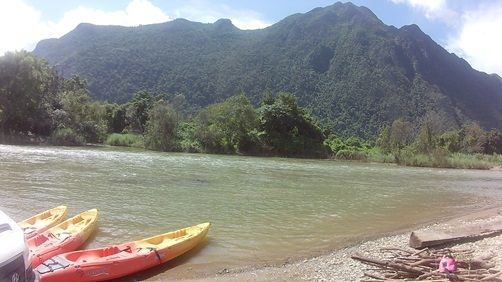 อันนี้คือระเบิดที่เมกาเคยทิ้งไว้ เขาเลยเอามาทำเป็นระฆัง        ไฮไลต์ของเรามาถึงแล้ววว คือเราจำได้เลยว่าเออเนี่ยถ้าไปที่วังเวียงยังไงก็ต้องไป"ล่องคายัค" เพราะวิวระหว่างทางสวยจริงงๆแล้วสนุกแล้วก็คุ้ม เราได้จับคู่การพายคายัคกับคนเกาหลีคนนึงเป็นผู้หญิง จุดพีคคือว่าเราก็นั่งข้างหลังเพราะต้องบังคับเรือ เลยให้เขานั่งหน้า แล้วที่นี้ตอนพายมันมีแม่น้ำไป 2 ฝั่งช่ะ แล้วทีนี้เขาก็ให้พายไปฝั่งซ้าย แต่พวกเราดันโดนน้ำพัดพายไปอีกฝั่งนึง ซึ่งตอนนี้พอมองไปที่แม่น้ำแล้วทุกคนหายไปหมด เหลือแค่เรือเราลำเดียว อินังเกาหลีก็ไม่ได้ช่วยอะไรเล้ยย เอาแต่ร้องแหกปากโวยวาย เราก้เลยบอว่า stay calm stay calm 555555555 แล้วจากนั้นก้เริ่มค่อยๆหมุนตัว หมุนตัว แล้วก้ค่อยพายไป พายไป จนในที่สุดเราก้ตามทัน เย่!  ทีนี้ระหว่างทางที่พายไป ในระยะทางเกือบ 10 กิโล บอกเลยว่าวิวสวยมากกก ลองไปก็เพลินไป ทำให้เราลืมความเมื่อนไปได้เลย แล้วก็มีแวะพักที่"บาร์น้ำ" คือมันก็ไม่มีไรอ่ะ เป็นแค่เพิงไม่ไผ่แล้วก็มีขายเบีย เปิดเพลงฝรั่งดังๆ 5555555 พอพายเสร็จแล้วเราก็ขึ้นฝั่งไป Blue lagoon