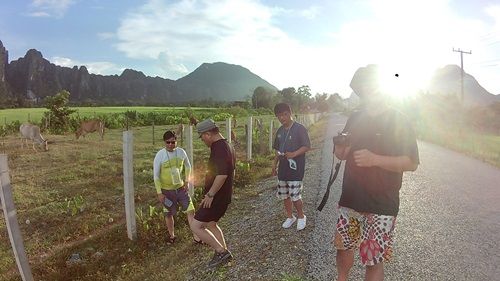 เราเดินกลับมานั่งกินที่ที่พัก เพราะตอนเช้าเขามีกาแฟฟรีให้ เออดีไปอย่าง 5555 แล้วมีฝรั่งคนนึงมานั่งข้างหน้าเรา เราก็เลยชวนเขาคุย ก็นั่นแหละมันเป็นจุดเริ่มต้นการหาเพื่อนสไตล์คนเที่ยวคนเดียวอย่างเรา คนที่เราคุยด้วยเนี่ยชื่อ Antonio เขาเป็นคน italian มาเที่ยวที่เชียงใหม่ก่อนแล้วก็มาต่อที่วังเวียงเนี่ยแหบละ สักพักมีผู้หญิงไทยคนนึงมานั่งข้างๆเขา พี่เขาก็บอกว่าเขาเป็นไกด์นำเที่ยวของชาวอิตาเลี่ยนพวกนี้แหละ เราก็คุยกันไปสักพัก เล่าว่าเรามาคนเดียวนะ จองตั๋วเครื่องบินได้ถูกอย่างงั้นอย่างี้ 55555 ทำให้บรรยากาศตอนเช้าเริ่มดีขึ้นมาบ้างนะ