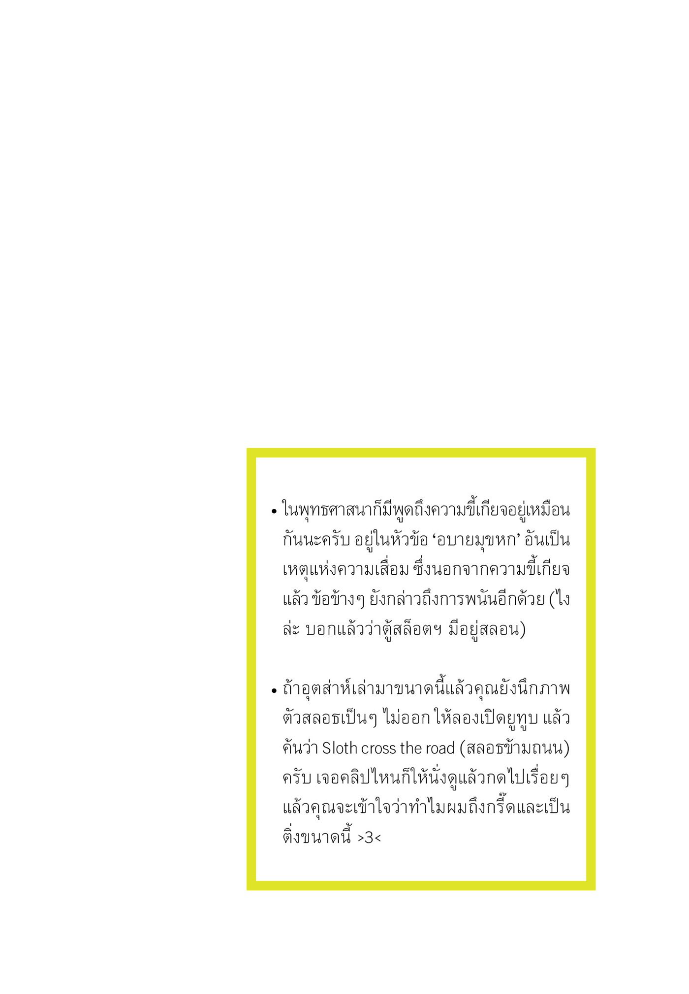 ระหว่างที่ผมเขียนต้นฉบับอยู่นี้ ข้างๆ เป็นชั้นหนังสือ มีพจนานุกรมเล่มหนาเตอะวางอยู่ ด้วยความที่อยากจะอธิบายให้คุณได้เข้าใจ เลยลองเปิดดูเผื่อจะเจอคำอธิบายความหมายง่ายๆ ของคำว่าสลอธและก็พบว่าไม่มี... คำที่ใกล้เคียงที่สุดคือคำว่า ‘สล็อตแมชชีน’ (น. วงดนตรีไทยวงหนึ่งที่มีนักร้องนำเสียงแหลมสูงทะลุชั้นบรรยากาศโลก ...ไม่ใช่ละ มันเป็นเครื่องเล่นการพนัน มีลักษณะเป็นตู้หยอดเหรียญเสี่ยงโชคต่างหาก)