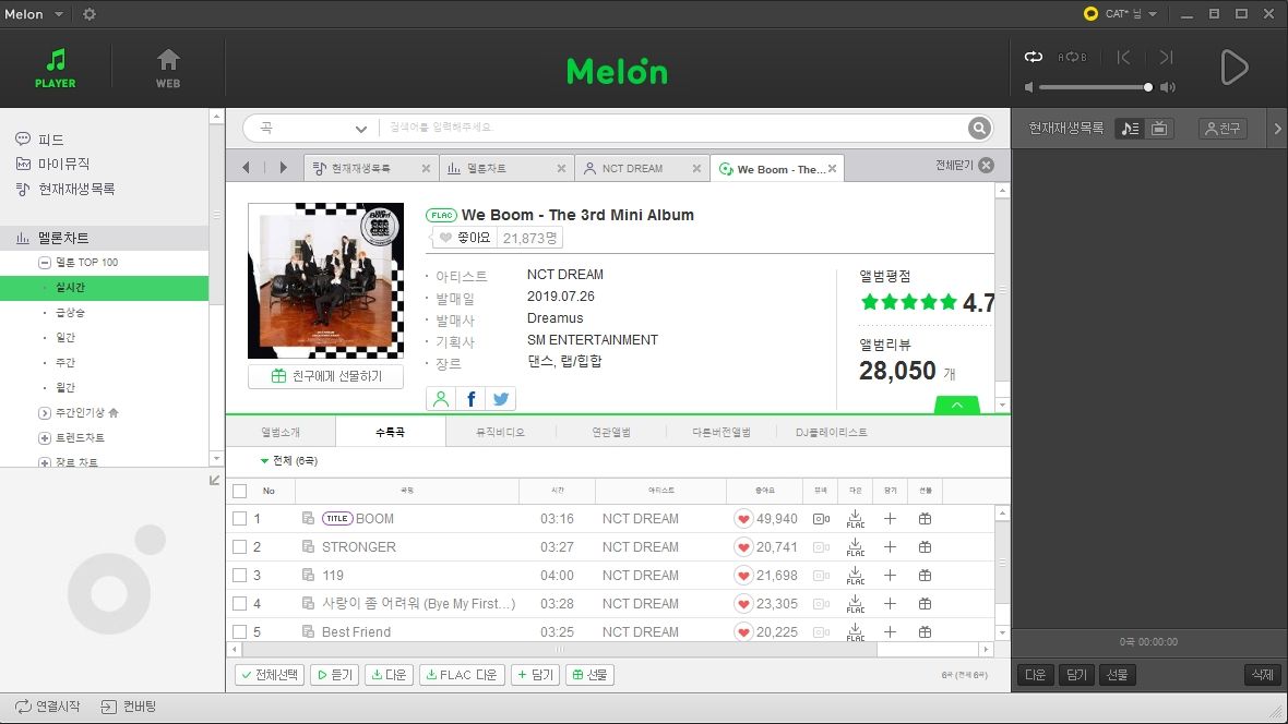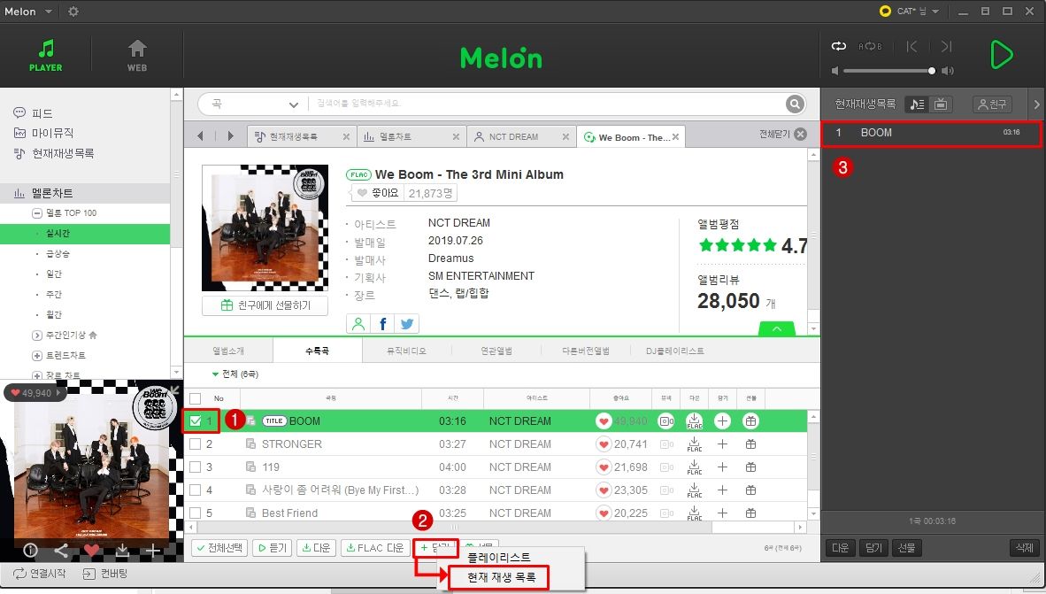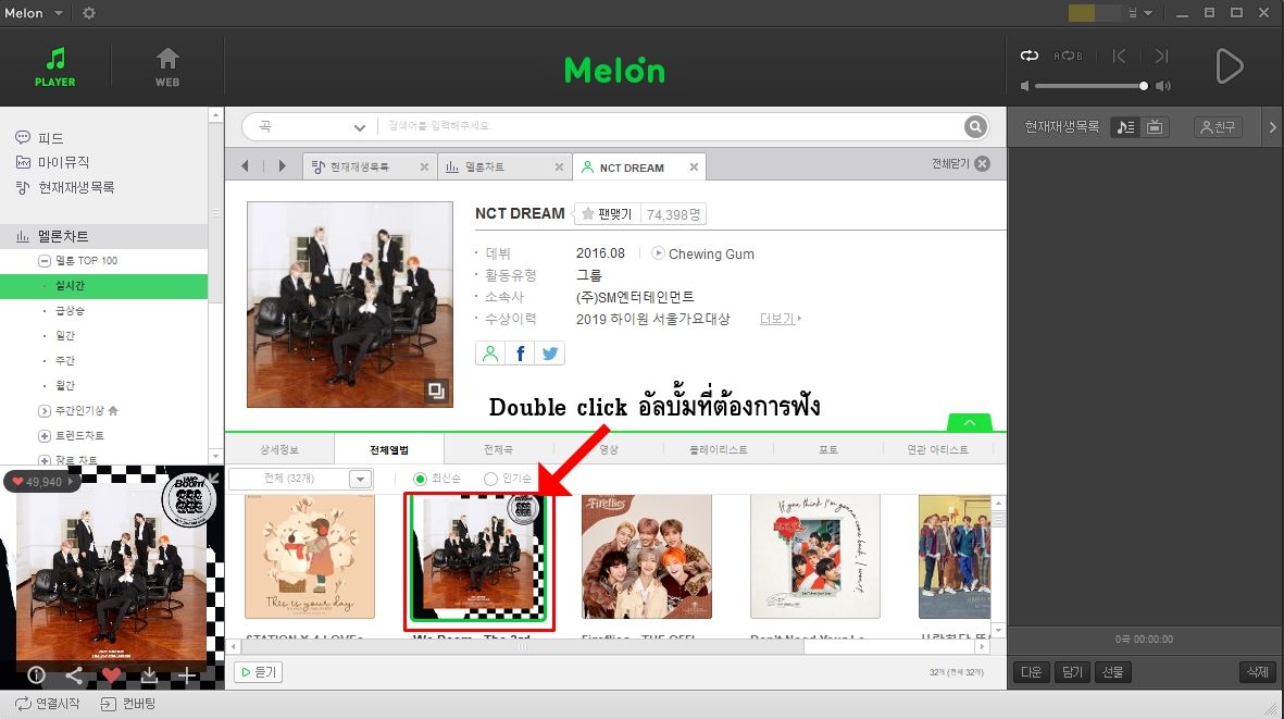เมื่อคลิกเข้าไปที่ชื่อ NCT DREAM แล้ว จะปรากฏหน้าต่างของศิลปิน ด้านล่างจะมีอัลบั้มต่าง ๆ ของน้อง ให้กด Double click อัลบั้มที่ต้องการฟัง ดังรูปด้านล่างนี้