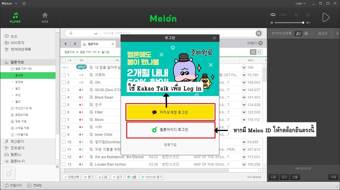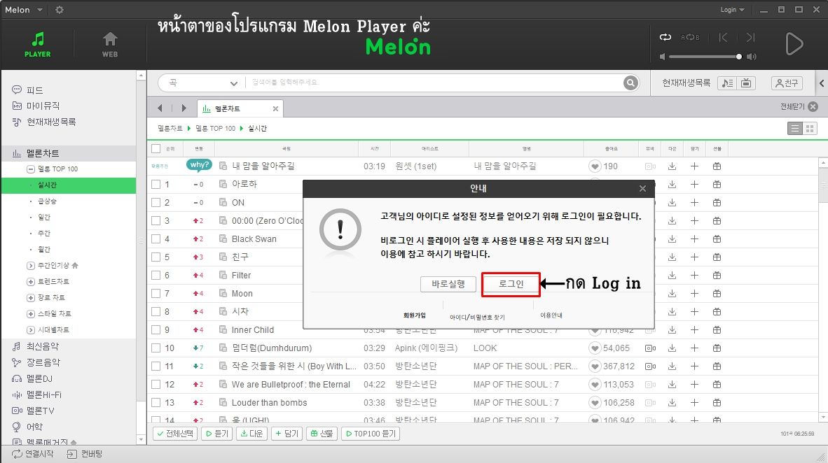 เมื่อทำการเปิดโปรแกรมแล้ว ตัว Melon Player จะขึ้นตามรูปด้านล่างค่ะ หากมี Melon Account อยู่แล้วสามารถกด Log in ได้ทันทีค่ะ