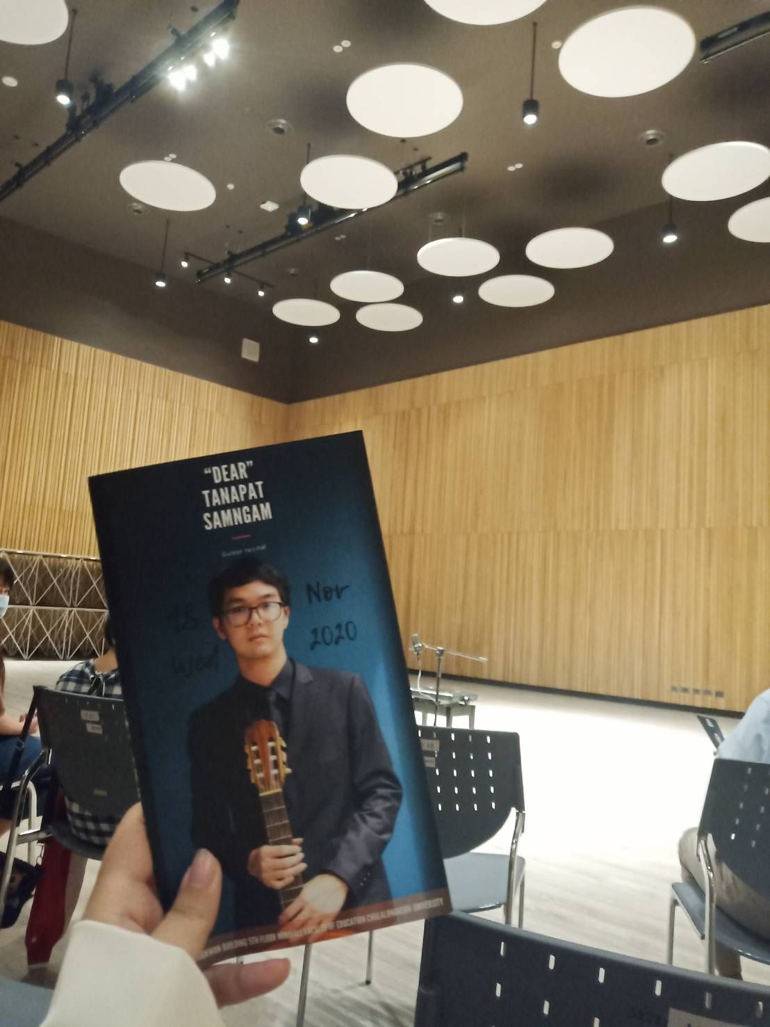 มาก่อนเวลา17:00น.ก่อนงานเริ่มแสดง เข้าไปข้างในห้องโถงแล้วนั่งรอก็ได้อ่านประวัติของพี่เดียร์ก่อนพี่เดียร์เป็นเด็กธรรมดาที่บังเอิญได้มีโอกาสไปเรียนกีตาร์คลาสสิกที่โรงเรียนดนตรีกาญจนาภาตอนแรกพี่เขาไม่ได้สนใจในด้านดนตรีเป็นพิเศษ เรียนเพื่อความเพลิดเพลิน วันวานผ่านไปพี่เดียร์ได้ไปแข่งขันด้านดนตรีเข้าค่ายทำให้พี่เดียร์หลงใหลในเสียงเพลงของกีตาร์คลาสสิคซึ่งพี่เดียร์ได้รับรางวัลมากมาย อาทิ รางวัลรองชนะเลิศอันดับ 1 BrillanteJunior Competition 2012 ณ โรงแรมพักพิงอิงทาง เป็นรางวัลแรกที่พี่เขาประสบความสำเร็จและยังมีได้รับอีก 4 รางวัลตามมา ปัจจุบันพี่เดียร์ศึกษาอยู่ในระดับปริญญาตรีชั้นปีที่ 4 สาขาดนตรีศึกษา คณะครุศาสตร์จุฬาลงกรณ์มหาวิทยาลัย