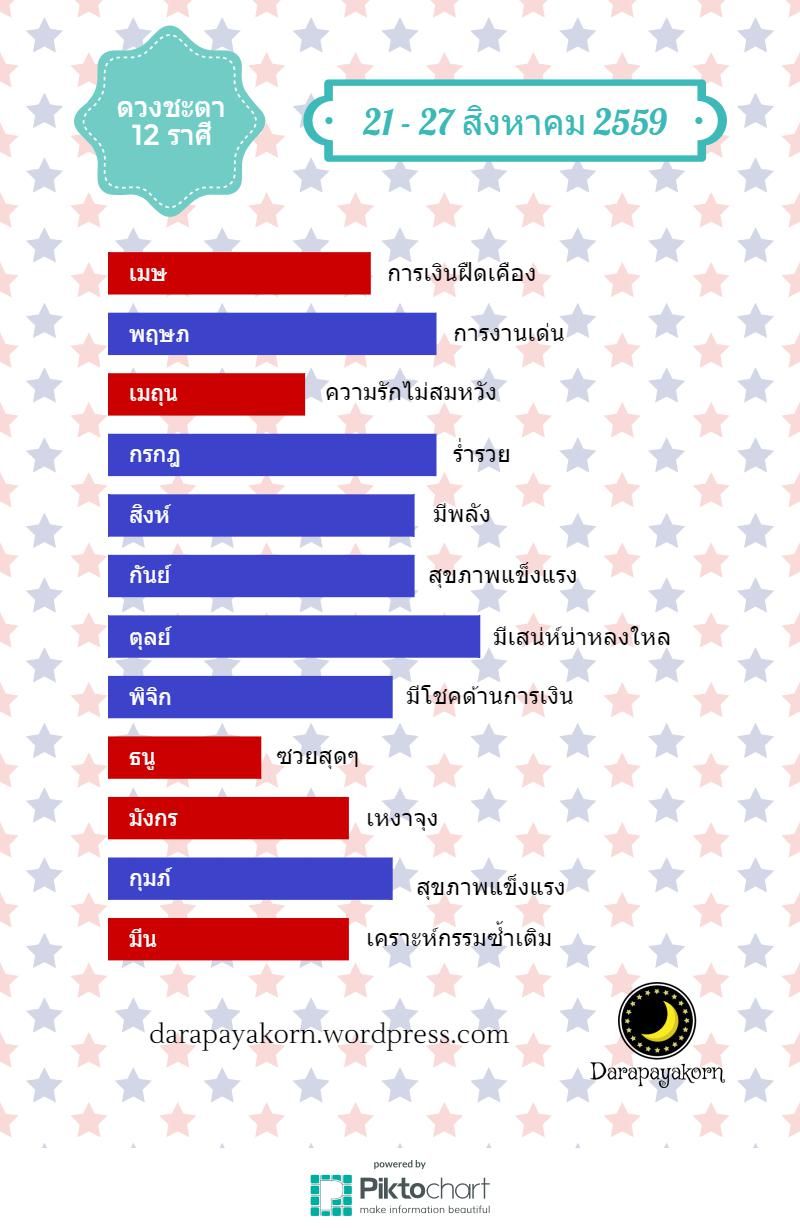 การเงินถึงจะมีรายรับมากแต่ก็จะมีรายจ่ายมากด้วยเช่นกัน มีสติในการชอปปิ้งด้วยจะได้ไม่ต้องไปซดมาม่ายามสิ้นเดือน ด้านการงานจะมีการทุจริตหรือหลอกลวงกันเกิดขึ้น คนที่ภายนอกดูเป็นคนดีอาจจะไม่ใช่อย่างนั้นเสมอไป ใช้สติแยกแยะให้ดี ด้านความรัก คนขี้กังวลแอบเช็คโทรศัพท์แฟนบ้างก็ดี เพราะมีเกณฑ์อีกฝ่ายออกนอกลู่นอกทาง คุยกันด้วยเหตุผล อย่าใช้อารมณ์มากเกินไป ด้านสุขภาพแข็งแรงดี ฟิตปั๋ง มีเกณฑ์ได้รับโชคลาภอย่างไม่คาดฝันจากผู้หญิงคนหนึ่ง