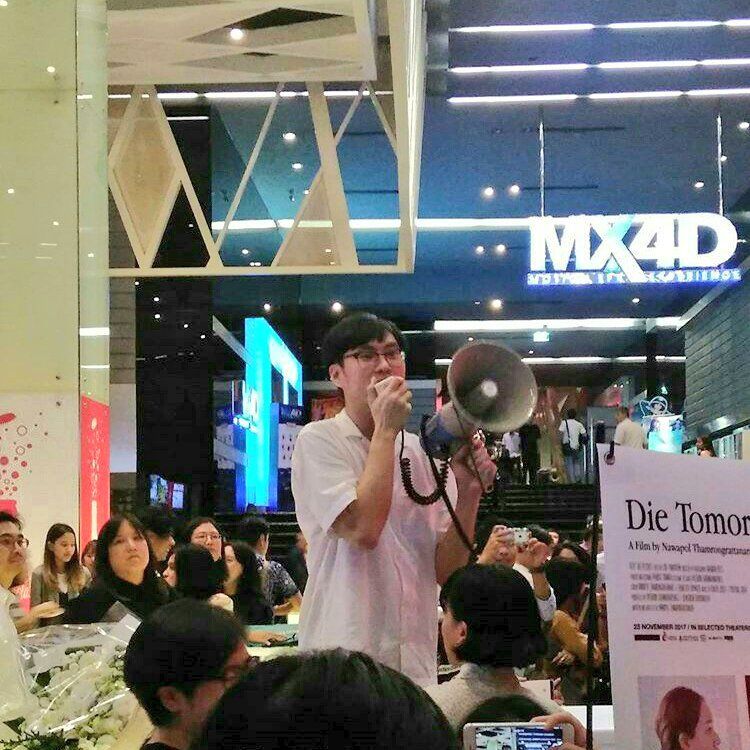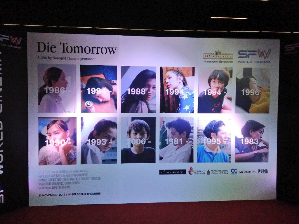 อย่างที่บอกไปตอนแรกว่าเราได้บัตร Die Tomorrow มา แล้วเราก็รีบมาเลยวันนี้ แต่หาที่รับบัตรไม่เจอจ้า ... จนต้องไปถามเคาท์เตอร์ เขาก็บอกว่าเชิญชั้น 9 เลย พอขึ้นไปที่ชั้น 9 โอ้โห คนเต็มไปหมดเลยจ้า ทั้งผู้กำกับ นักแสดง บลาบลา ในใจก็คิดว่า เออ เจอวีคนเดียวก็พอแล้วมั้ง แต่ว่าหลังจากรับบัตรเสร็จแล้ว น้องก็ชี้ให้ดูพาย (เจอพายวันนี้ แล้ว Die Tomorrow ก็โอเค) นั่นแหละครับ เราก็เข้าไปคุยกับพาย อีกสักพัก พี่เต๋อแกก็ปีนเก้าอี้พร้อมกับหยิบโทรโข่งขึ้นมาประกาศว่าโรงมีปัญหา ต้องย้ายโรง... เราก็รอเรียกคิวไปสิ หลังจากนั้นก็ได้เข้าโรง ตามตารางมันจะต้องฉายตอน 20.00 น. แต่มีปัญหา ทำให้ได้ฉายจริงในเวลา 21.00 น. ก็นั่นแหละครับ ชีวิต