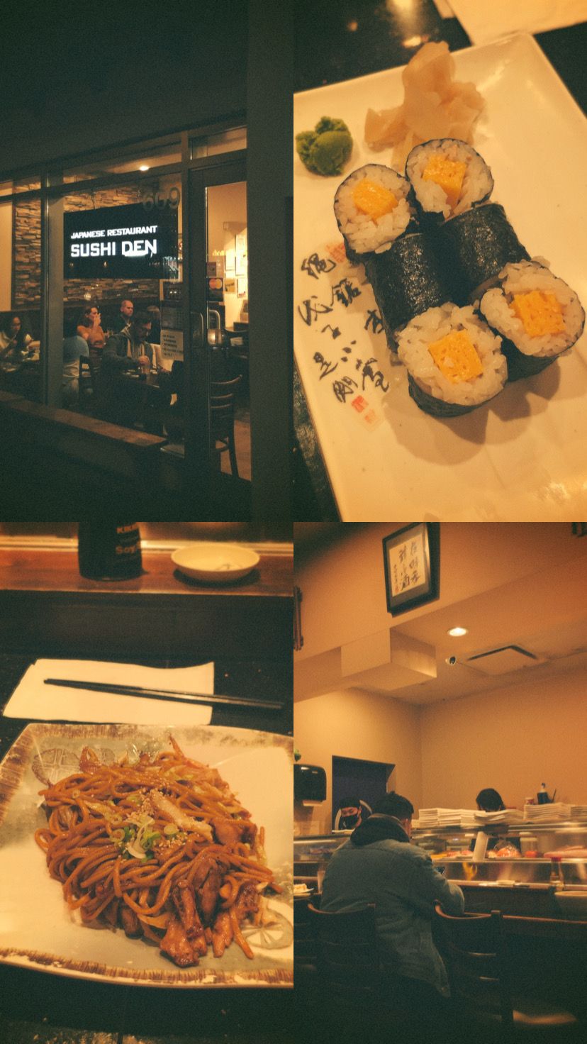 ร้าน "Sushi Den" เป็นร้านซูชิที่มีทั้ง ซูชิ ราเมง ดงบุริ และอาหารญี่ปุ่นที่บีมจะนึกออกได้ คือที่นี่เป็นร้านญี่ปุ่นราคาน่าคบหามาก ๆ รสชาติอร่อยด้วยนะ เป็นร้านที่ไปกินซ้ำเยอะที่สุดแล้ว ปกติไม่อยากเข้าร้านอาหารเพราะไม่อยากเสียตัง แต่ที่นี่ถ้ากินจริง ๆ บริหารเงินดี ๆ อาจถูกกว่าการซื้อของมาทำกินเองที่บ้านด้วยซ้ำ ซูชิบางหน้าได้ 8 ชิ้นใหญ่ ๆ กับราคา $4 ซึ่งมันถูกมากจริง ๆ นะ อย่าซูชิในภาพประมาณ $2 กว่า ๆ เอง คือแบบ งุ้ยยยยย เอาตังบีมไปเลยค่า