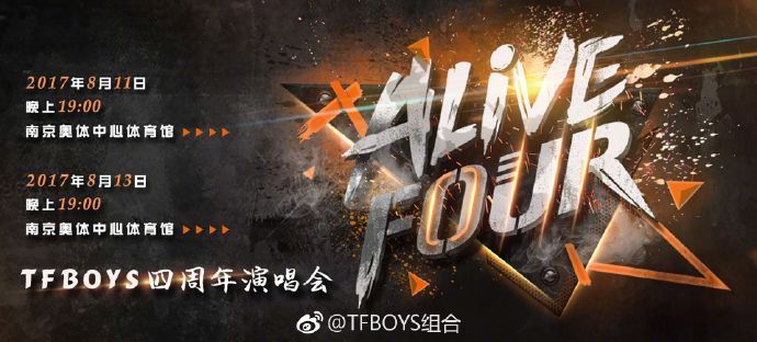 TFBOYS组合 ซึ่งเป็นเว่ยป๋อออฟฟิเชียลของ TFBOYS แปะรูปนี้ ประกาศว่า งานครบรอบครั้งที่ 4 จะใช้ไตเติ้ลว่า "Alive Four" และขอให้แฟนๆ ติดตามข่าวสารที่จะอัพเดททุกๆ วันพฤหัส ความตื่นเต้นยิ่งเพิ่มเป็นทวีคูณ