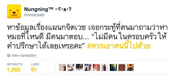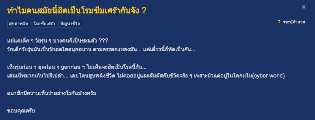 ว่าเฮ้ย โรคซึมเศร้ามันเป็นโรคนะ มันคืออาการป่วย ซึ่งจะมาบอกว่าฮิต หรือวัยรุ่นหัดเป็นกันเยอะไม่ได้