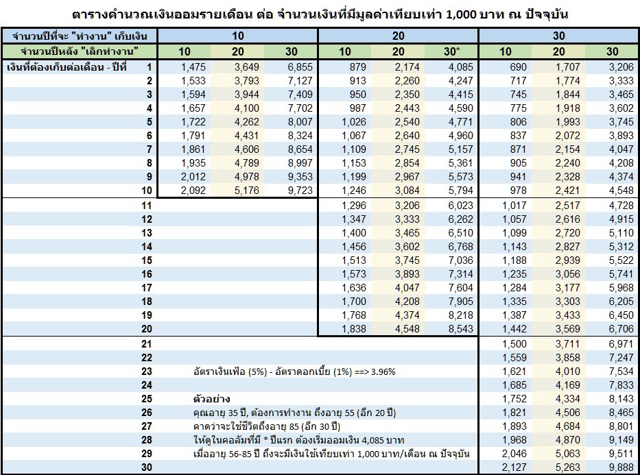 วิธีดูตารางนี้คือ ตั้งเป้าไว้ก่อนว่าจะทำงานอีกกี่ปี แล้วหลังจากทำงานจะใช้ชีวิตแบบไม่หาเงินเลยอีกกี่ปี แล้วก็ประมาณเอาว่า เดือนนึงเราใช้เงินกี่บาท
