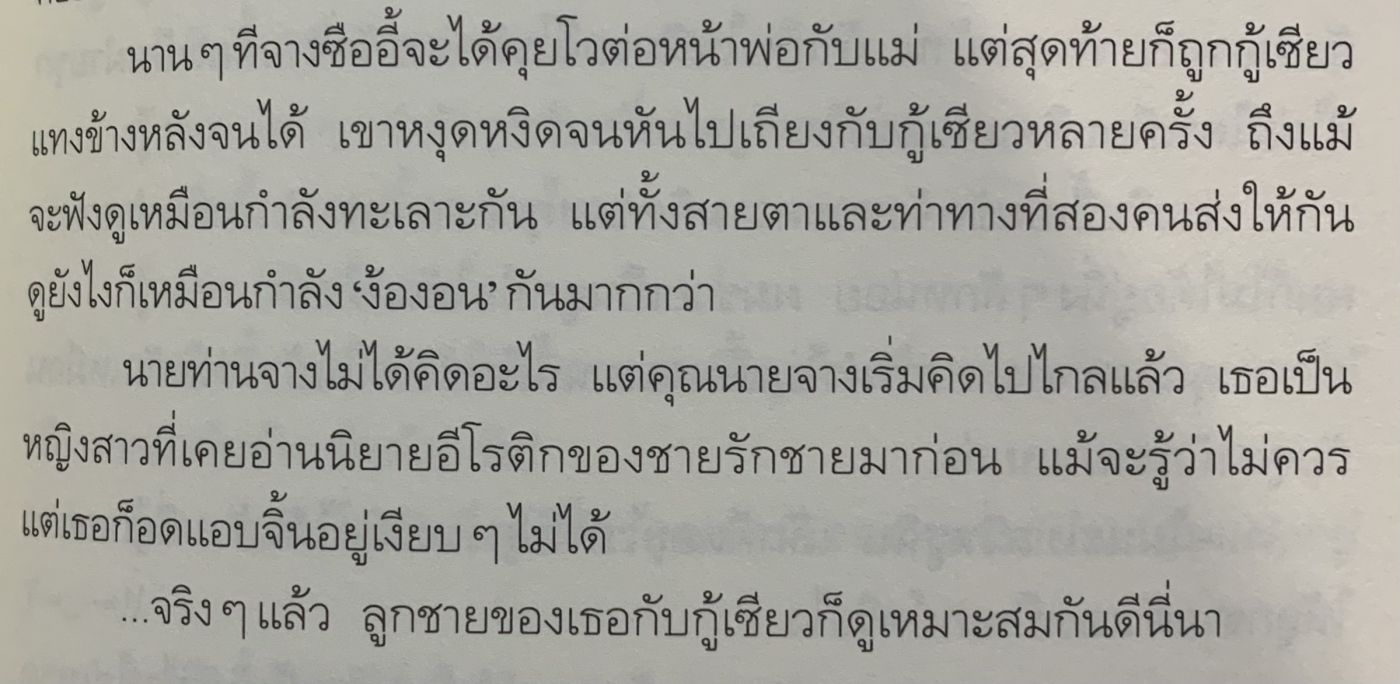 ส่วนเรื่องบ้านของทางจางซืออี้ก็พูดไม่ได้ว่าง่ายเหมือนทางบ้านกู้เซียวเพราะอย่างแรกแหละคือเป็นลูกชายคนเดียวแล้วก่อนหน้านี้ก็ไม่มีท่าทีเบี่ยงเบนเลย ความขำก็คือที่พ่อของจางซืออี้รับได้เป็นเพราะการพูดคุยของบ้านของกู้เซียวที่ส่งบทความแล้วก็discussกันเรื่องนี้ จนทำให้พ่อแบบเข้าใจ Happy