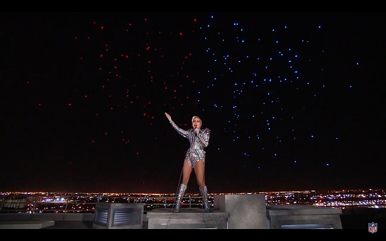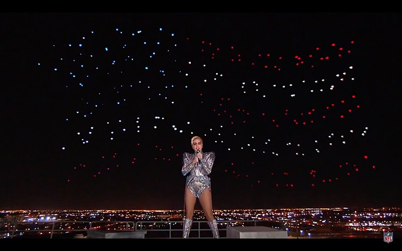 - กาก้าก็โอเค้ นางไม่พูดเรื่องอะไรเลย แต่กูอยู่บนหลังคาสเตเดี้ยม ฉากหลังเป็นเมือง ยังกะแบทแมนกับเมืองกอทแฮม แล้วนางก็ร้องเพลง God Bless America ฉากหลังเป็นโดรนสองสีบินบนฟ้า แดง น้ำเงินเ หมือนสองพรรคใหญ่ แล้วโดรนก็รวมกัน เปลี่ยนสี เพิ่มสีขาว กลายเป็นธงชาติ สื่อว่าเออ ประเทศมึงประเทศกู คนละพรรคกัน แต่ก็ประเทศของเรานะ