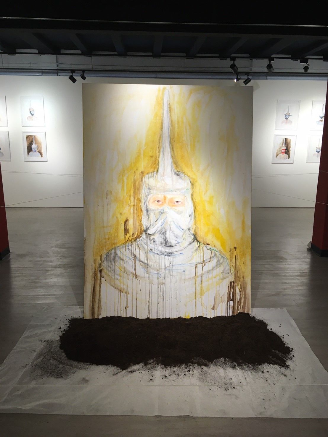 ภาพนี้เป็นงานใหญ่สุดที่อยู่ตรงกลาง ล้อมรอบไปด้วยสายสิญจน์ พื้นด้านล่างเป็นดิน ศิลปินกำลังพูดถึงความเชื่อ เรื่องเทวดา ดินเหมือนที่สุดท้ายที่เราต้องตายจากไป ตอนเด็ก ๆ ศิลปินเคยได้รับคำทำนายว่าจะอายุสั้น แต่เขาก็ไม่เชื่อและยังใช้ชีวิตมา พร้อมทั้งนำพื้นหลังเหล่านั้นแสดงออกทางผลงาน