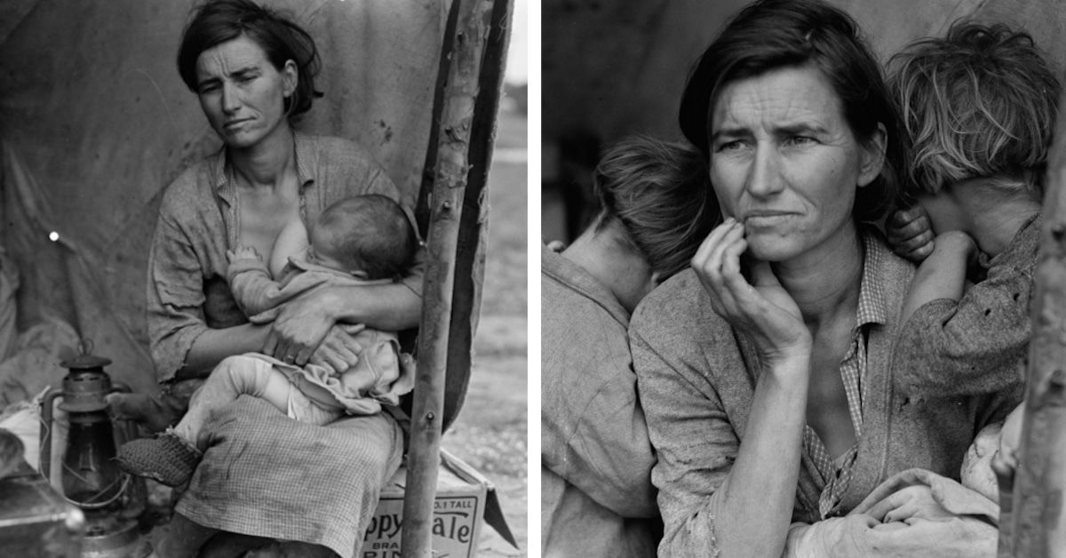 1936 เป็นปีที่มี Great Depression ในสหรัฐอเมริกา ภาพนี้เป็นเหมือนสัญลักษณ์ของเหตุการณ์ที่เกิดขึ้นตอนนั้น แม่ที่ต้องอพยพเข้ามาเพื่อหางานทำ แต่งานไม่มี ลูกก็ต้องเลี้ยง โดยเฉพาะรูปทางขวาที่ขับเน้นสีหน้าของคนเป็นแม่ แต่ในภาพก็มีเด็ก ๆ ขนาบอยู่ด้านข้าง