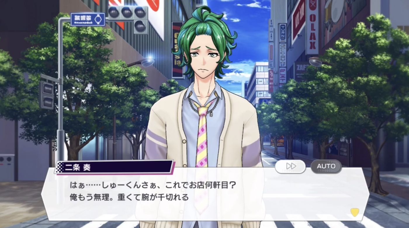 คานาตะ : เฮ้อ… ชูคุง ร้านที่เท่าไรแล้วเนี่ย? นี่ไม่ไหวแล้วนะ หนักจนแขนจะหลุดแล้วเนี่ย
