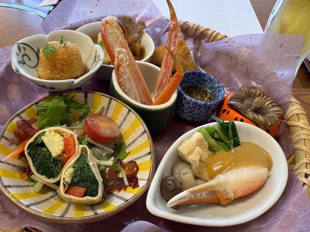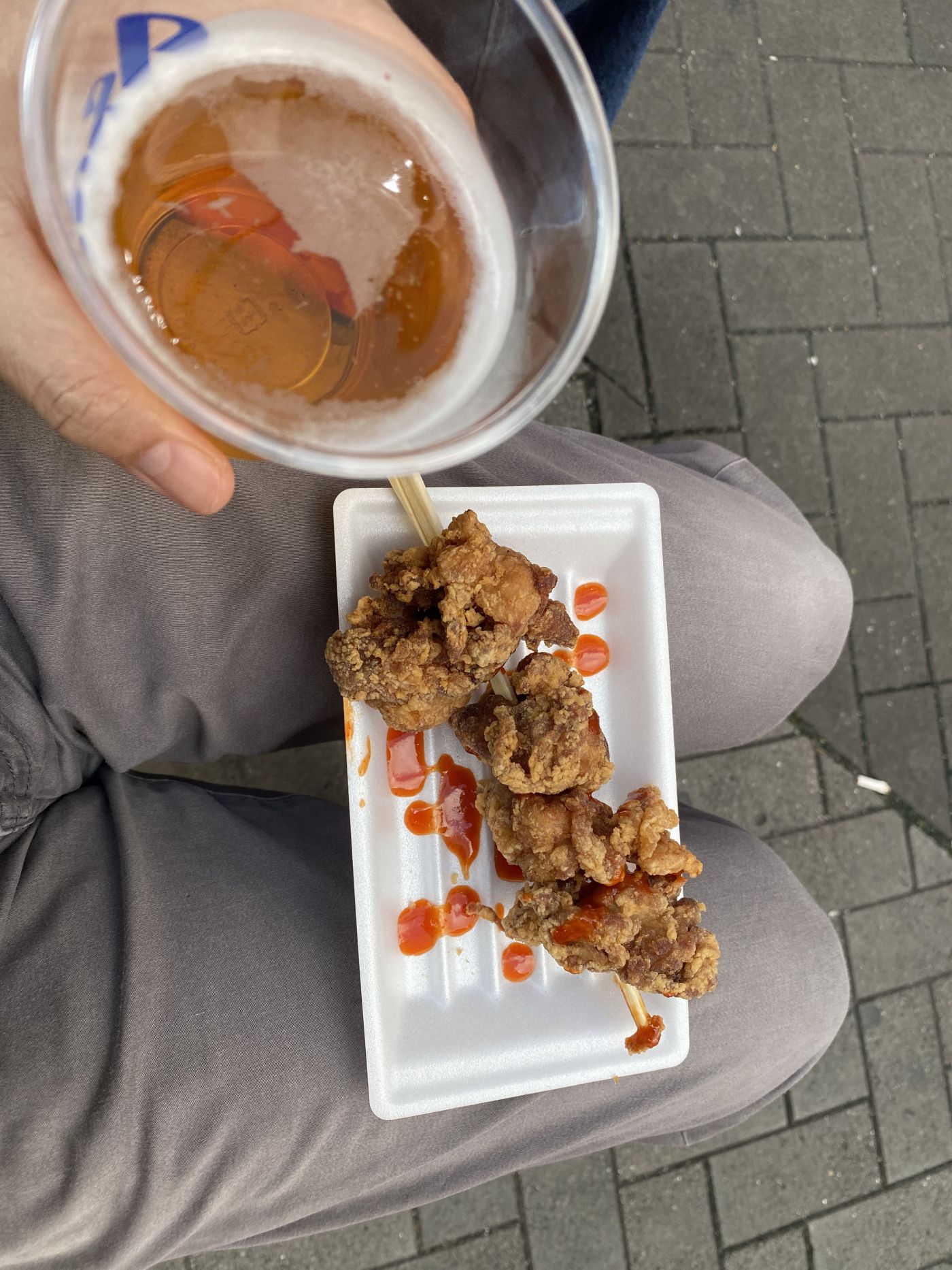 พอเดินออกมาที่ซอยที่อยู่ด้านหลัง ก็เต็มไปด้วยร้านข้างทางที่ส่วนใหญ่ขายทาโกยากิ ของปิ้ง ของทอด และเบียร์!! ตัดสินใจซื้อของมานั่งกินกัน โดยรวมก็อร่อยดี ไก่ทอดอร่อย (แต่เยอะ) และปูอัดกับไก่ย่าง (แคทซังไม่ชอบของชุดแป้งทอด ผมเลยอดกินไปด้วย) นอกจากของกินแล้วยังมีร้านขายของฝาก หนึ่งในร้านที่ดูเหมือนจะเป็นไฮไลท์คือร้านที่มีกลองตีอยู่ด้านหน้า(ฟังไปนาน ๆ ก็รำคาญเล็กน้อย) ร้านมีคาแรคเตอร์เป็นตัวผู้ชายใส่ชุดตัวตลกหรือละครสัตว์อะไรทำนองนั้น (ถึงหน้าตาเขาจะไม่ค่อยเข้ากันกับชุดที่เขาใส่ก็ตาม) เข้าไปด้านในก็ซื้อของฝากกันมาให้คนอื่นบ้าง ให้ตัวเองบ้าง