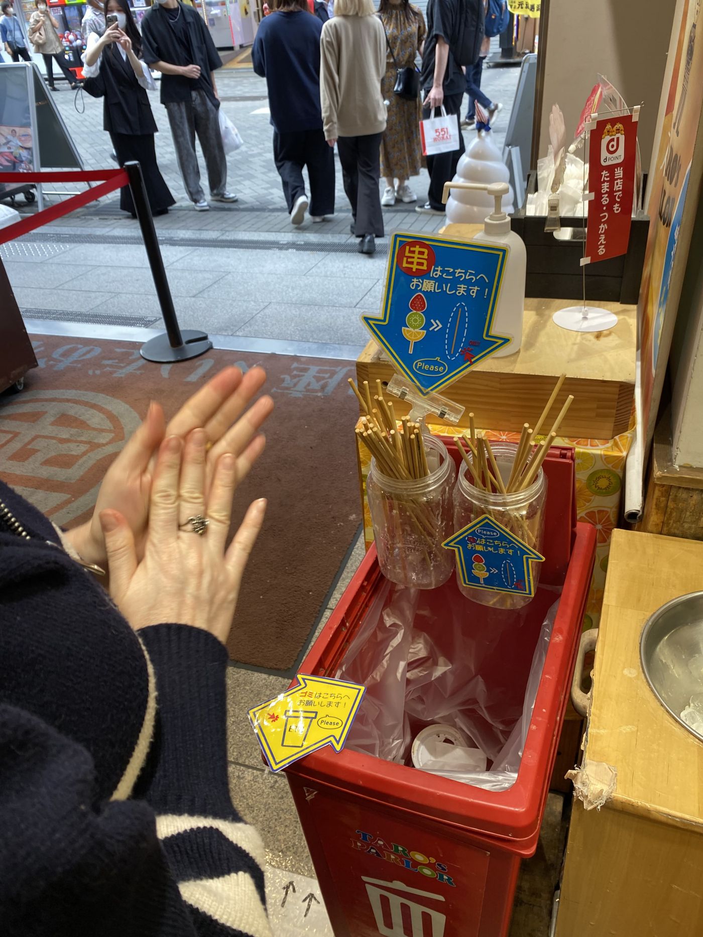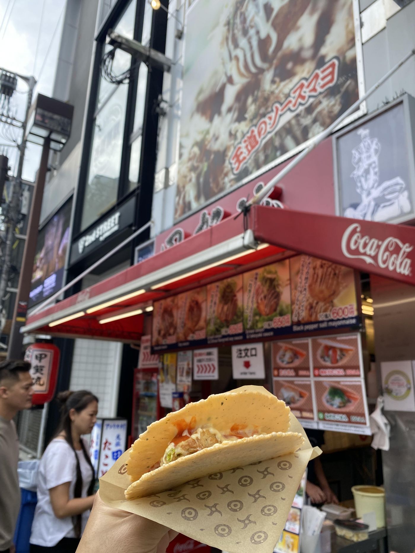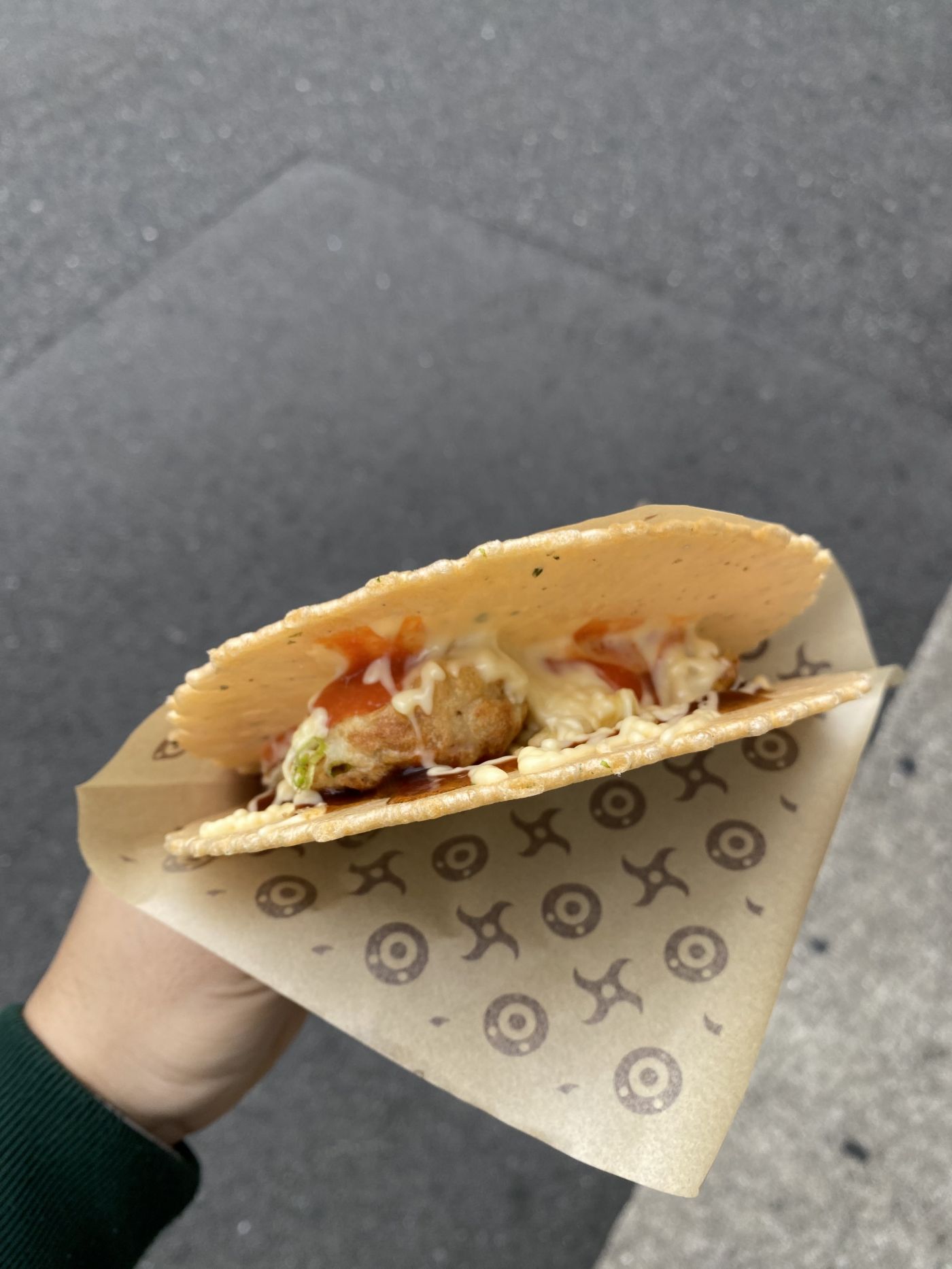 Tako-sen คือการเอาทาโกยากิมาวางลงบนเซนเบ้ (Senbei) ซึ่งรสชาติก็อร่อยเข้ากันมาก และพอสั่งจากร้านนี้ คนก็จะมานั่งกินกันตรงเก้าอี้ฝั่งตรงข้ามอย่างสบายใจ (มารู้ที่หลังว่าตรงข้ามเป็น landmark ของย่านนี้ เรียกว่า Triangle Park เป็นสวนเล็กๆ รูปทรงสามเหลี่ยม)
