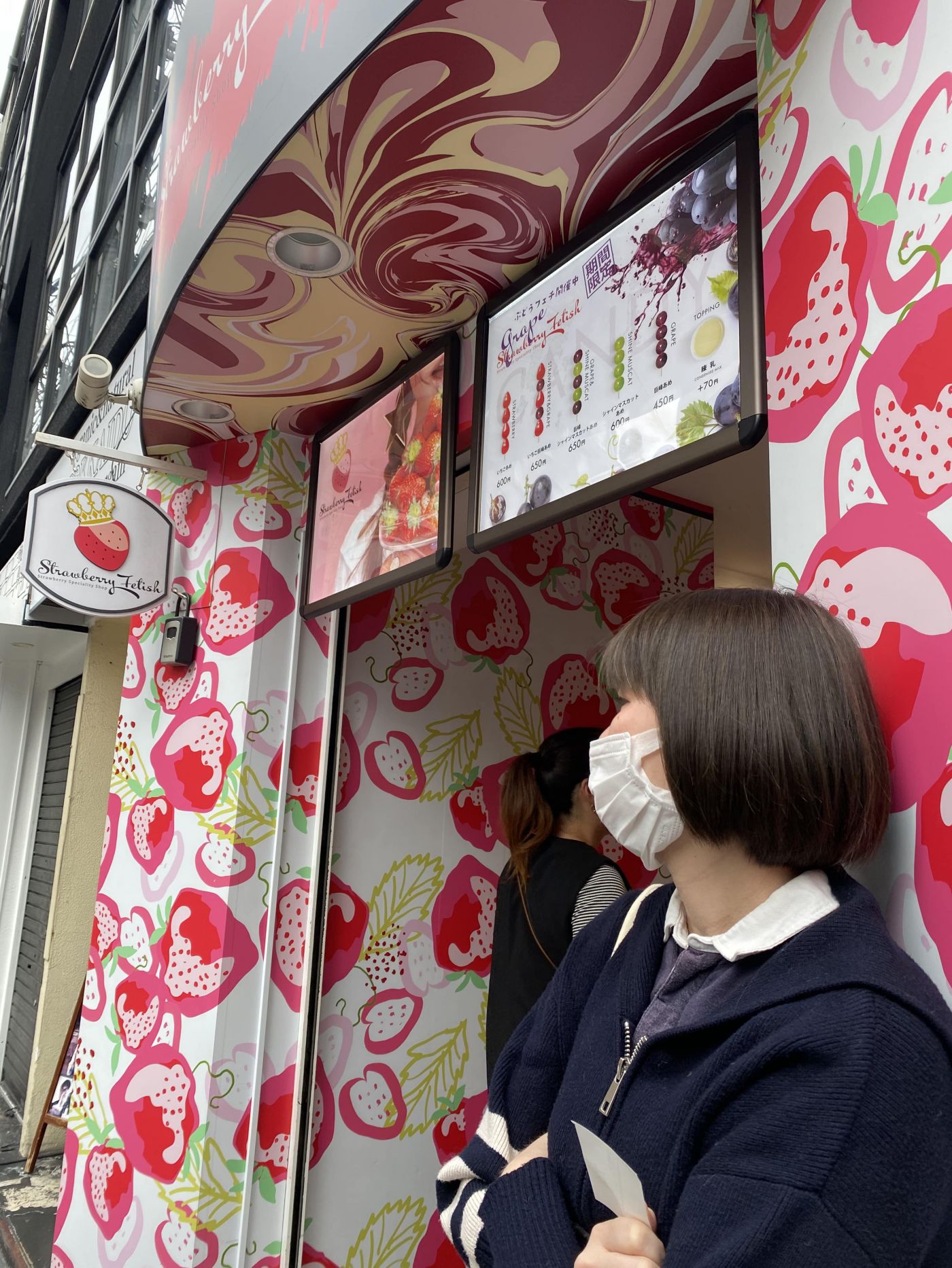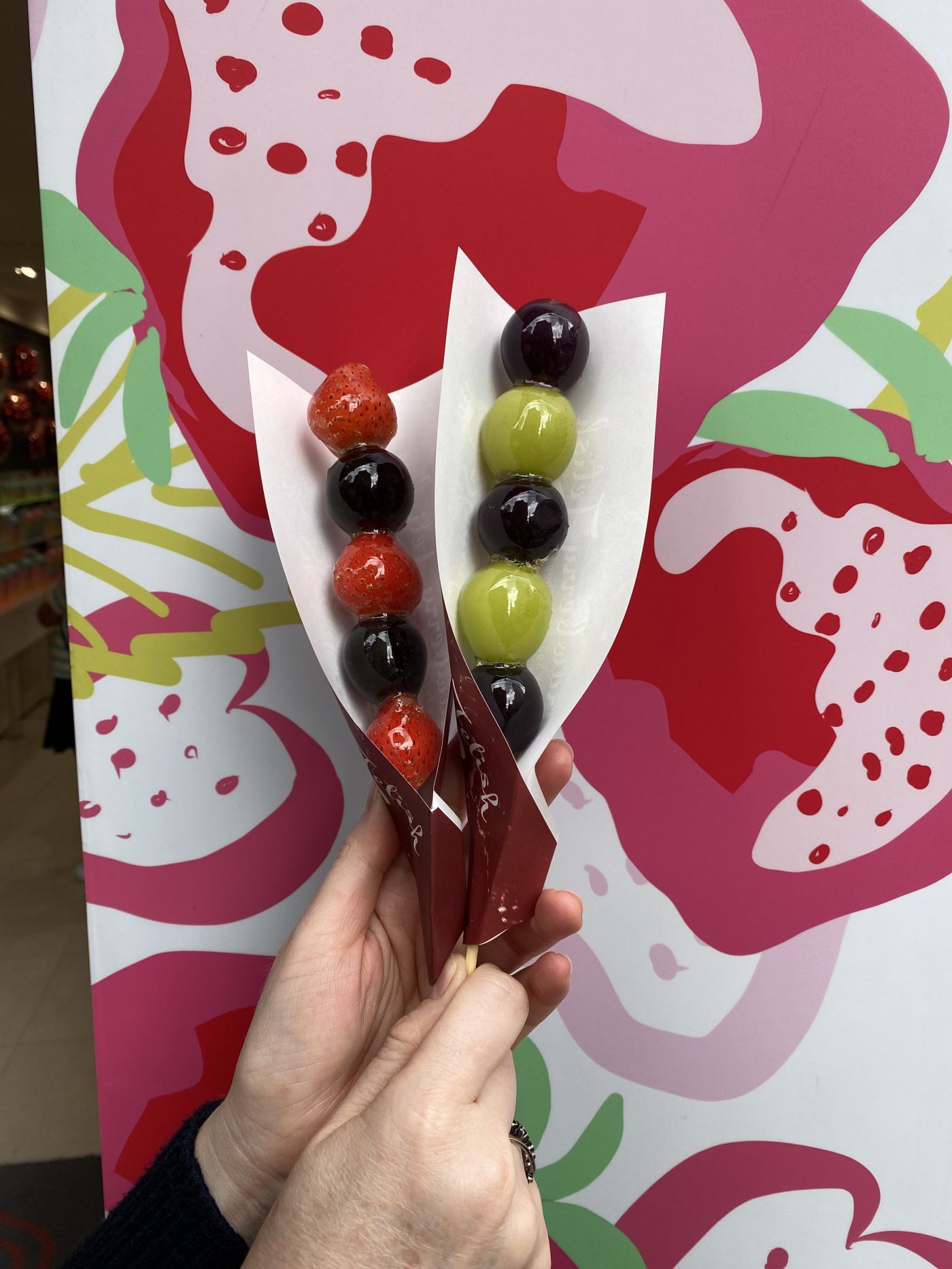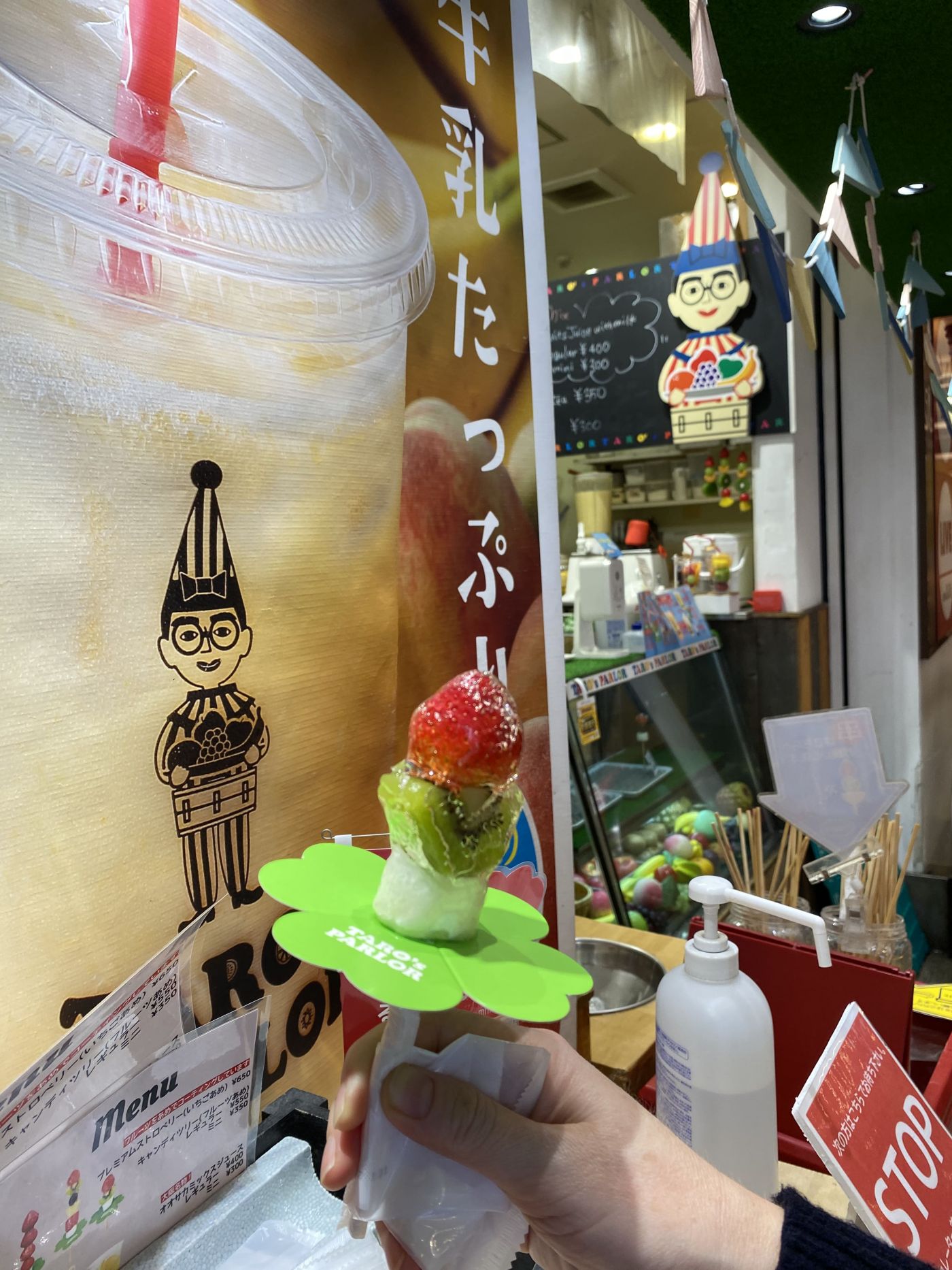 ร้านที่แคทซังเดิน ๆ อยู่เจอก็เข้ามาเลย (มีอยู่ในลิสต์) เป็นร้านขายผลไม้จำพวกองุ่นหรือสตรอว์เบอร์รี เสียบไม้ แล้วนำไปเคลือบน้ำตาล ผมกินแล้วก็อร่อยดีนะ จะกลัวในตอนกัดครั้งแรกเพราะมันจะแข็ง ๆ หน่อย แต่พอกัดเข้าแล้วเคี้ยวพร้อมกับผลไม้ มันก็เข้ากันอย่างน่าตกใจเหมือนกัน หวานกันคนละแบบแต่ไม่เกินไป (ที่ญี่ปุ่น ผมสังเกตุว่าจะทำของกินทุกอย่างหวานไม่มาก) น้ำตาลที่เคลือบก็เพิ่มรสสัมผัสให้การกินสนุกขึ้นไป ตอนไปต่อแถวก็มีเด็ก ๆ มาต่อ เช่นกัน