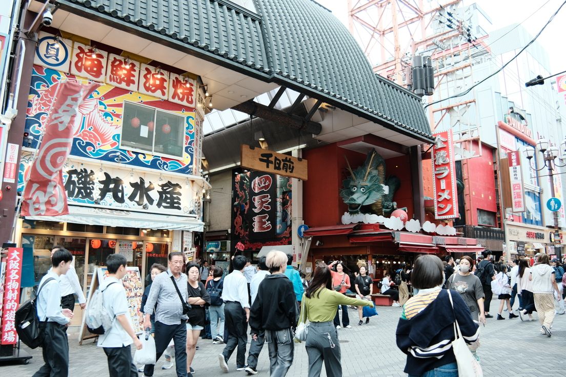 เดินจากตรงนั้นมาไม่ไกล ก็เริ่มสังเกตุได้ถึงฝูงชนที่เดินไปในทิศทางเดียวกัน พอเดินเข้าไปในตรอกที่มีหลังคา (คิดว่าเป็น Shinsaibashi-suji) ก็เจอกับร้านค้ามากมายสองข้างทาง พร้อมกับคนที่เดินกันขวักไขว่ แต่ร้านที่เราแวะเข้าไปนานที่สุดเห็นจะเป็น ร้านกด Gachapon ที่มีถึงสองชั้น เรียกว่าแลกเหรียญกันจนหนักมือ เดินวนเวียนหาตู้ที่อยากจะกดกัน อันที่ผมชอบที่สุดน่าจะเป็นตู้กด มะม่วงจัง ซึ่งกดสองครั้งก็ได้อันที่อยากได้มาครบเลย ดีจัง