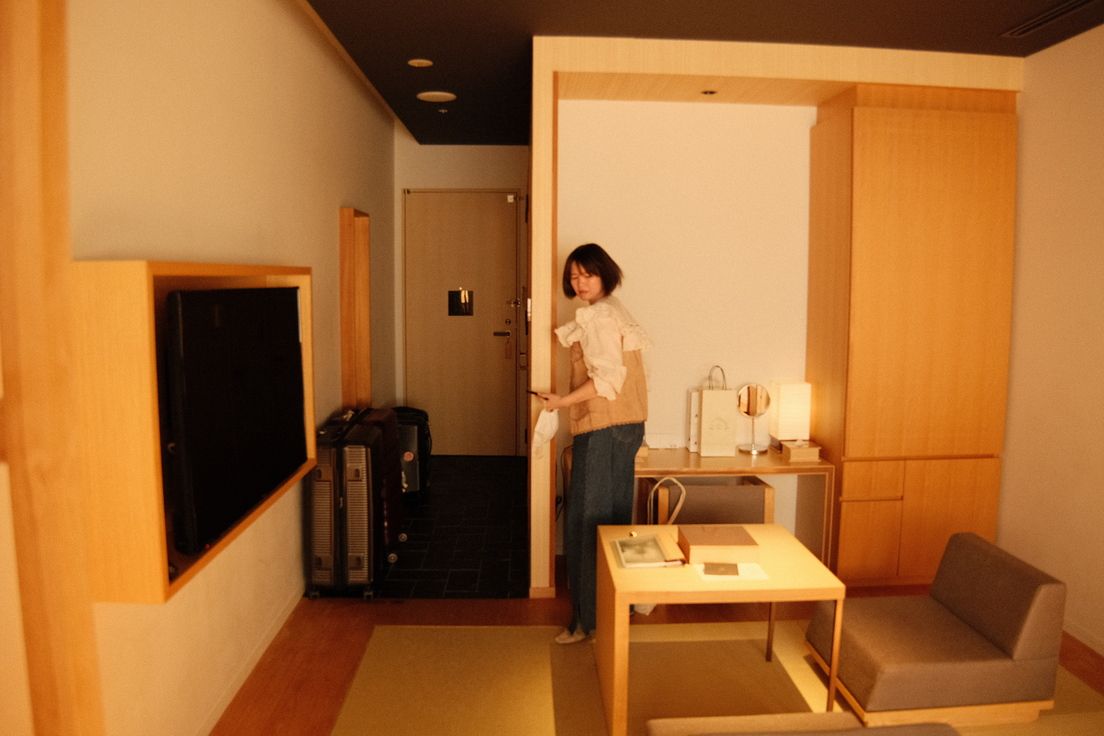 ถึงเวลาเช็คอิน เข้าไปนั่งตรงเคาร์เตอร์ พนักงานต้อนรับผู้ชายมาดนิ่ง(แต่เป็นกันเอง) คุยกับเราด้วยน้ำเสียงที่เรียบ ๆ แต่มีความตั้งใจ ถามเรื่องจำนวนวันที่จะมาพัก และบอกเราในเรื่องทั่วไปของการเข้าพัก เช่น สิ่งอำนวยความสะดวก ห้องอาหาร กุญแจที่จะได้(เป็นกุญแจแบบยุคเก่า) หลังจากพูดคุยเรื่องที่พักเขาชวนเราคุยถึงเรื่องเกี่ยวกับเกียวโต ว่าเราจะไปไหน ทำอะไรบ้าง และก็แนะนำร้านให้กับเรา (แคทซังจดเอาไว้บ้าง) เขาประหลาดใจเล็กน้อยที่เห็นว่าเธอรู้จักร้านต่าง ๆ เยอะ พอผมบอกว่าแคทซังเตรียมตัวมาอย่างดีและพูดภาษาญี่ปุุ่นได้นิดหน่อย(เพราะเรียนมา) เขาก็เริ่มคุยกับแคทซังเป็นญี่ปุ่น(เป็นคำง่าย ๆ ให้เธอได้ลองพูด) สักพักก็เดินมาแนะนำร้านขายของ/ที่จัด workshop ที่อยู่ด้านหน้าของโรงแรม มีของจำพวกเครื่องปั้นดินเผา เครื่องชาม ที่ขึ้นชื่อในแถบนี้ ทำออกมาในแนวร่วมสมัย มีมุมสำหรับ Workshop ทำ Kintsugi เพื่อซ่อมแซมเครื่องปั้นที่แตกหัก