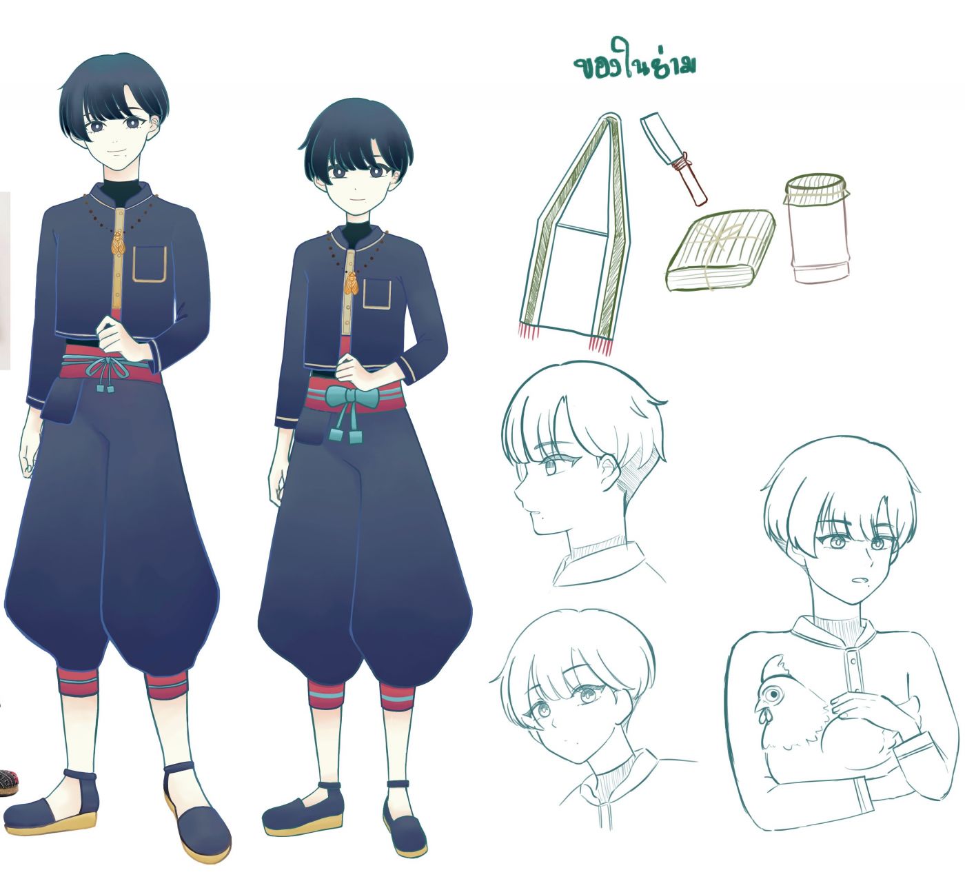 - รูปร่างของตัวละครให้ลองไปศึกษารูปร่างคนไทยสมัยก่อน ในส่วนของตัวละครเด็กถ้าอยากให้ดูเด็กลง แนะนำให้วาดหัวโตกว่าตัว